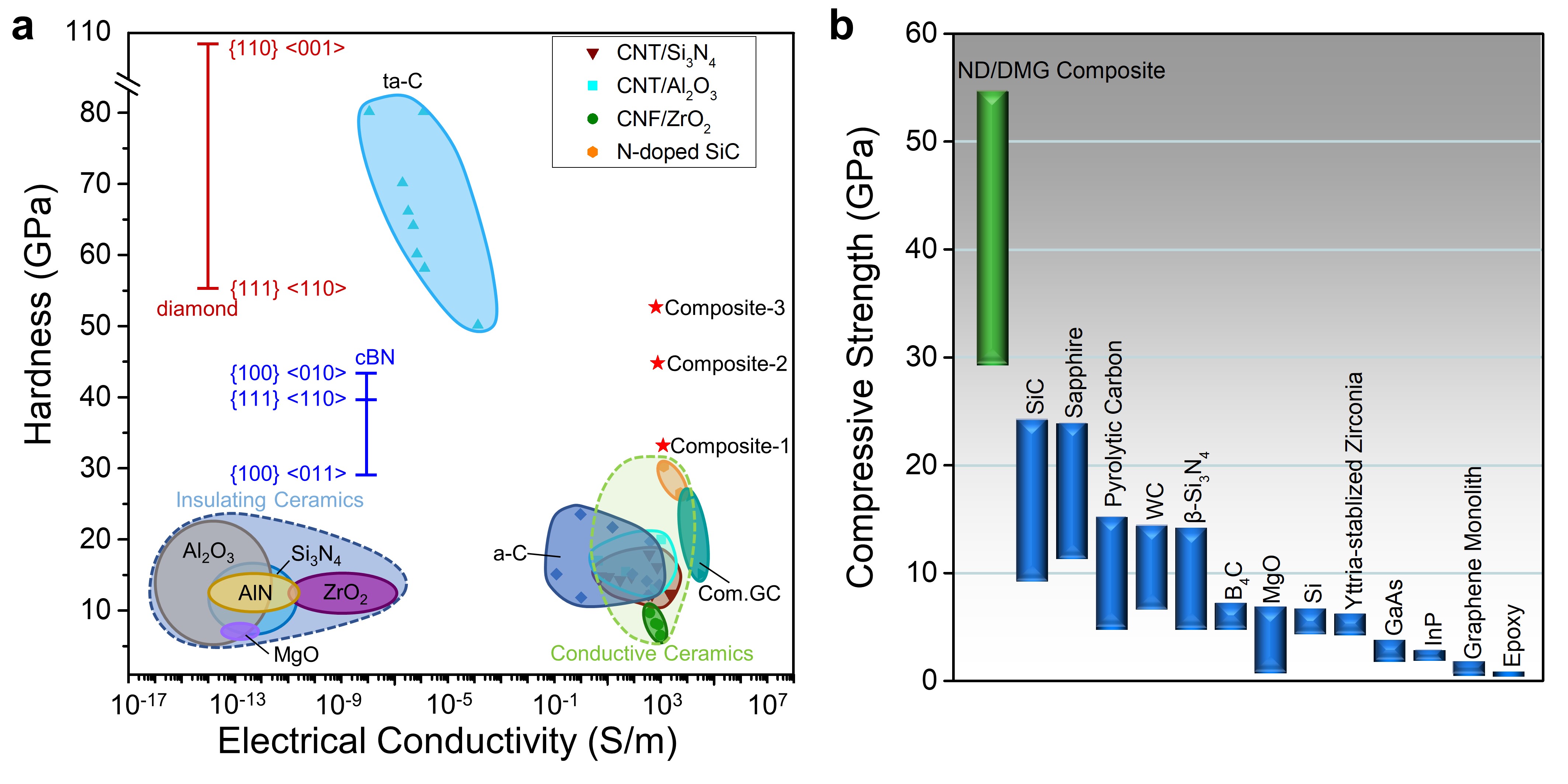 图2.纳米金刚石/无序多层石墨烯复合材料与其它材料的力学性能和导电性的对比