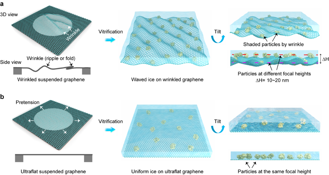 图1. 悬空石墨烯支撑膜的平整度影响冰层厚度均一性和成像质量