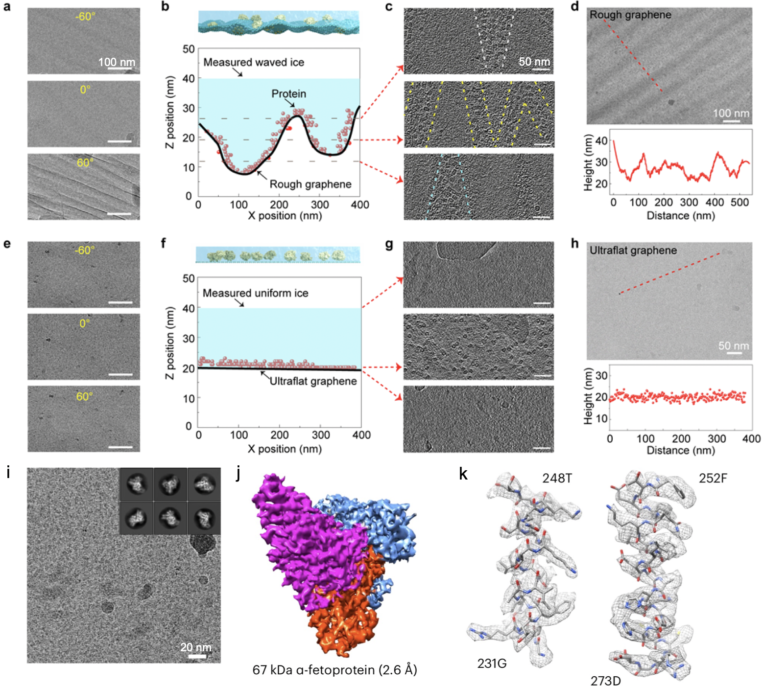 他们将超平整石墨烯载网用于冷冻电镜成像中,发现均匀薄冰能显著提高成像质量。一方面,超平整悬空石墨烯的预应力使得冰层在电子束辐照下不易发生翘曲,有效抑制了样品颗粒在成像时的漂移。另一方面,在不同的倾转角度下(-60°至60°),石墨烯表面均无褶皱结构,避免了高角度成像时褶皱对样品信号的遮蔽。经过测量,利用超平整石墨烯支撑膜所制备的冰层厚度约为20nm,比较均匀,既可有效封装生物大分子颗粒,也不会过多引入额外的背景噪音。并且,大多数生物大分子颗粒吸附于石墨烯表面,几乎处于同一高度,降低了成像时同一视野下局部欠焦值的差异。与粗糙起伏的石墨烯对比,超平整石墨烯支撑膜保证了高质量数据的收集,提升了成像效率。