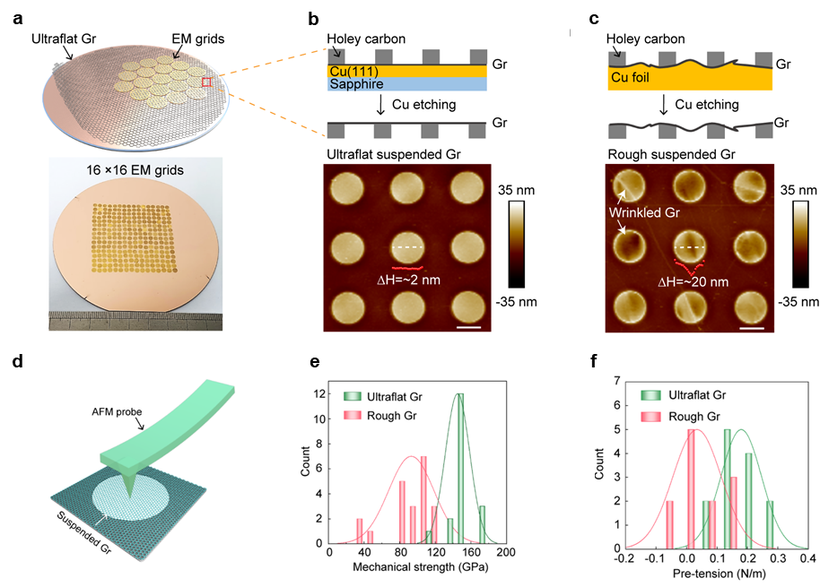 图2.超平整石墨烯载网的设计、制备与力学性质表征