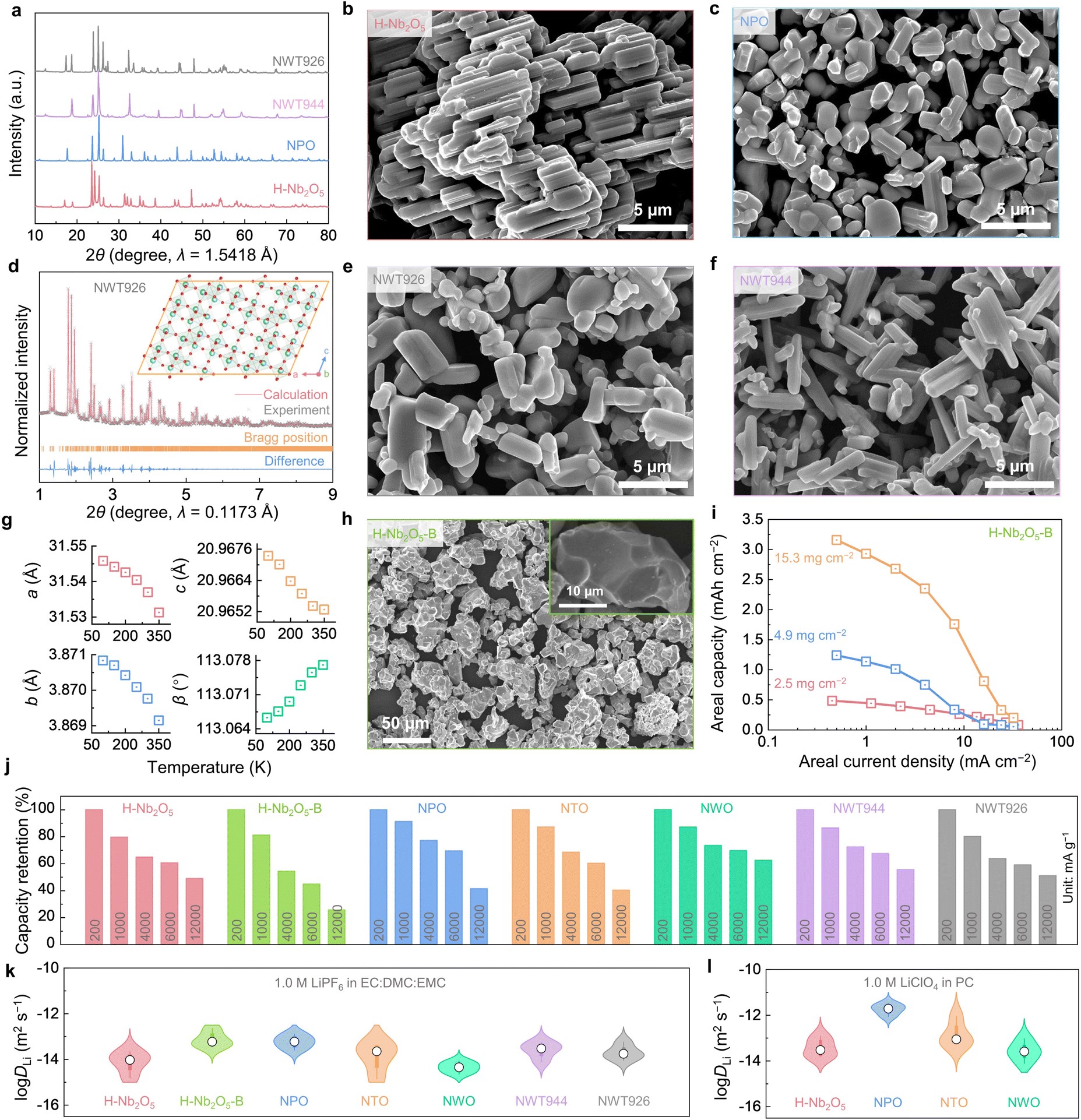 该研究中,作者首先定义了“前沸石框架结构”,即孔道直径小于水分子的致密晶体材料。因为这类结构排除了水分子和一般小分子的嵌入或吸收,同时允许锂离子在晶格内像表面扩散一样的快速迁移,有望使得这类结构同时满足高致密度及高功率的电化学性能。与锂离子嵌入型化合物不同,这类预沸石框架结构中由于较低的原子拓扑约束和较大的宿主自由体积会导致异常的热膨胀(低/负的热膨胀系数)和软声子特性,这也导致了块体晶格中类表面扩散机理的出现。接下来作者给出了这种预沸石框架结构的设计方法:其材料的孔道直径在2.5-2.8埃,阴离子与阳离子比约为2.5,可以但不限于包含铌、钨、钛等元素的氧化物。最后作者将上述设计方法应用于铌-钨-钛三元氧化物相图,并成功合成了一系列微米级高致密度及高功率的电极单晶材料。其中包括两种新物相材料:Nb9W2Ti6O40.5和Nb9W4Ti4O42.5,它们以高电极密度、高容量、高功率和长循环寿命的优异性能,胜于绝大部分现有的高功率电极材料。此外,作者还成功合成了大于20微米的超大单晶,仍可保持高于30C的大功率充放电,使得这类材料在保证高体积能量密度和高循环稳定性的基础上,具有和燃油车相似的充电体验和极速放电的特性。