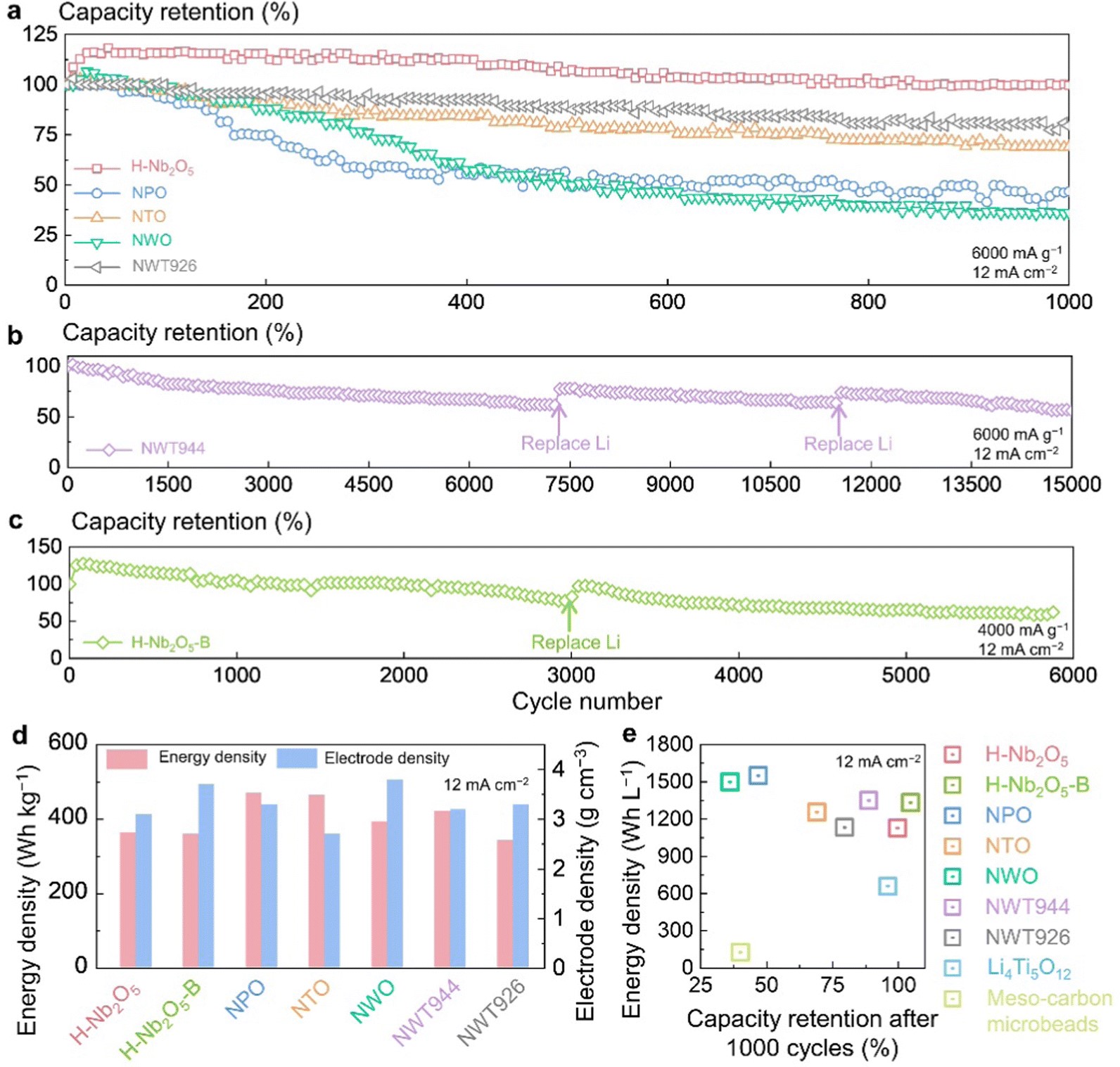 图3.具有前沸石框架结构材料的电池循环稳定性与能量密度特性
