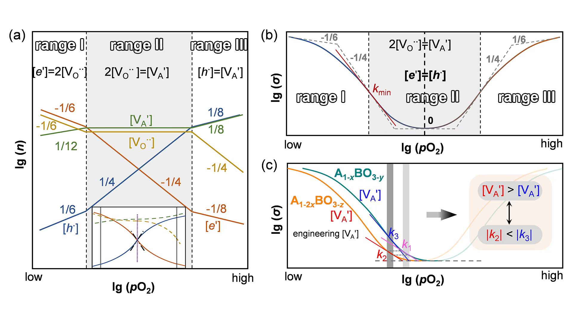 近日,乐鱼在线平台材料学院对KNN材料的缺陷化学环境进行理论分析,得出了A位缺陷浓度、氧空位浓度、电子浓度和空穴浓度在不同氧分压区间和氧分压的关系,并根据该关系提出了比较两种钙钛矿A位缺陷浓度的测试分析方法。结果表明,在同一氧分压区间内对两种钙钛矿进行电导率测试,电导率-氧分压斜率越陡峭代表材料中A位缺陷浓度越低(图1)。将此方法应用于KNN中,对KNN和A位过量的KNN(KNN-Na)进行电导率比较,可以发现KNN-Na的电导率斜率较KNN陡峭,KNN-Na中A位缺陷较低。这与实验设计和ICP测试结果一致。