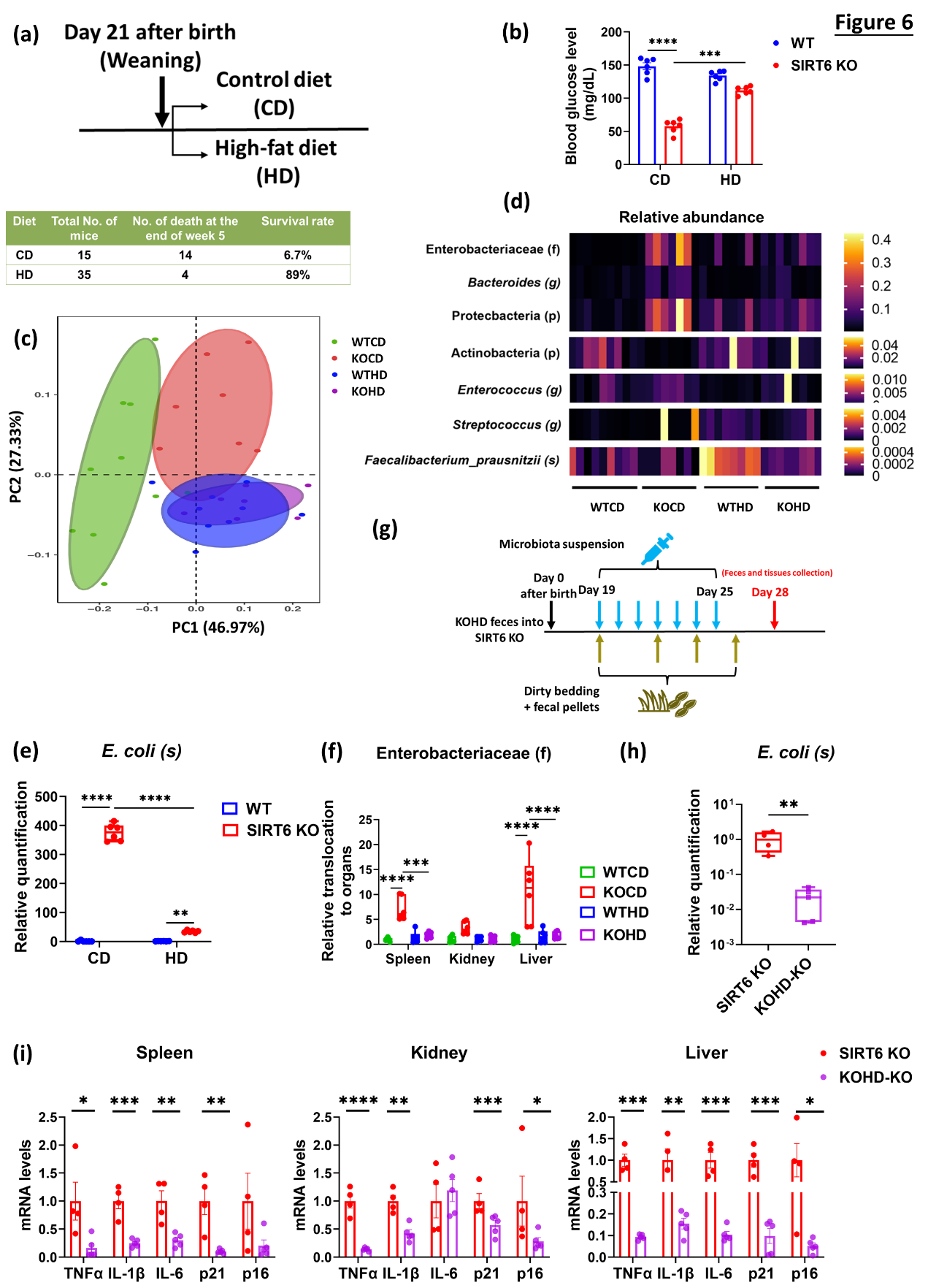 SIRT6敲除小鼠呈现典型的肠道菌群失调表征,包括菌群多样性减少,粪便中短链脂肪酸水平降低,益生菌Bacteroidetes丰度下降及致病菌Enterobacteriaceae、Verrucomicrobiaceae、Proteobacteria、Prevotellaceae等丰度增高。将SIRT6 KO小鼠肠道菌群移植给年轻野生小鼠,野生小鼠出现加速衰老相关表型,具体表现为白色粗糙毛发增多、血糖水平降低、脂肪积累减少、多组织器官炎症因子(TNFα、IL-1β、IL-6)和衰老标志物(P16、P21)表达水平增加等。