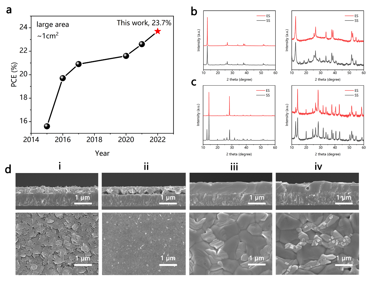 1cm2大面积钙钛矿太阳能电池认证效率纪录进展、真空蒸发&溶液(ES)组合工艺制备薄膜和全溶液法(SS)制备的薄膜表征