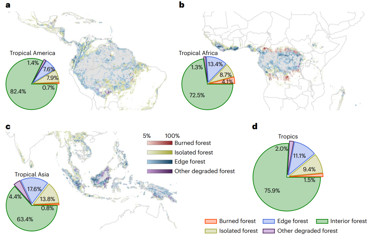 乐鱼在线平台地学系李伟副教授课题组联合国内外多所研究机构,利用高分辨率卫星观测数据,针对上述问题在热带雨林地区展开研究。研究首先识别了四类退化的热带雨林:被火烧过的森林、小斑块森林、边缘森林和其他退化森林(图1),分析了热带雨林退化导致的生物物理和生物地球化学效应,量化了1990-2010年间人为导致的热带雨林退化的生物物理和生物地球化学效应。研究发现,2010年24.1%的热带雨林发生了退化;发生森林退化区域的地表温度相比于没有发生退化的内部森林高了0.78±0.88°C,对整个热带区域而言,热带雨林退化造成了地表平均升温0.022±0.014°C;热带雨林退化造成的总碳亏缺达到了6.1±2.0PgC,带来的热带区域等效升温为0.026±0.013°C。热带雨林退化导致的生物物理及生物地球化学增温效应十分接近。1990-2010年,人为导致的热带雨林退化带来的白天地表温度升温为0.018±0.008°C,带来的碳亏缺为2.3±0.8PgC,与同期森林砍伐的影响量级相当。