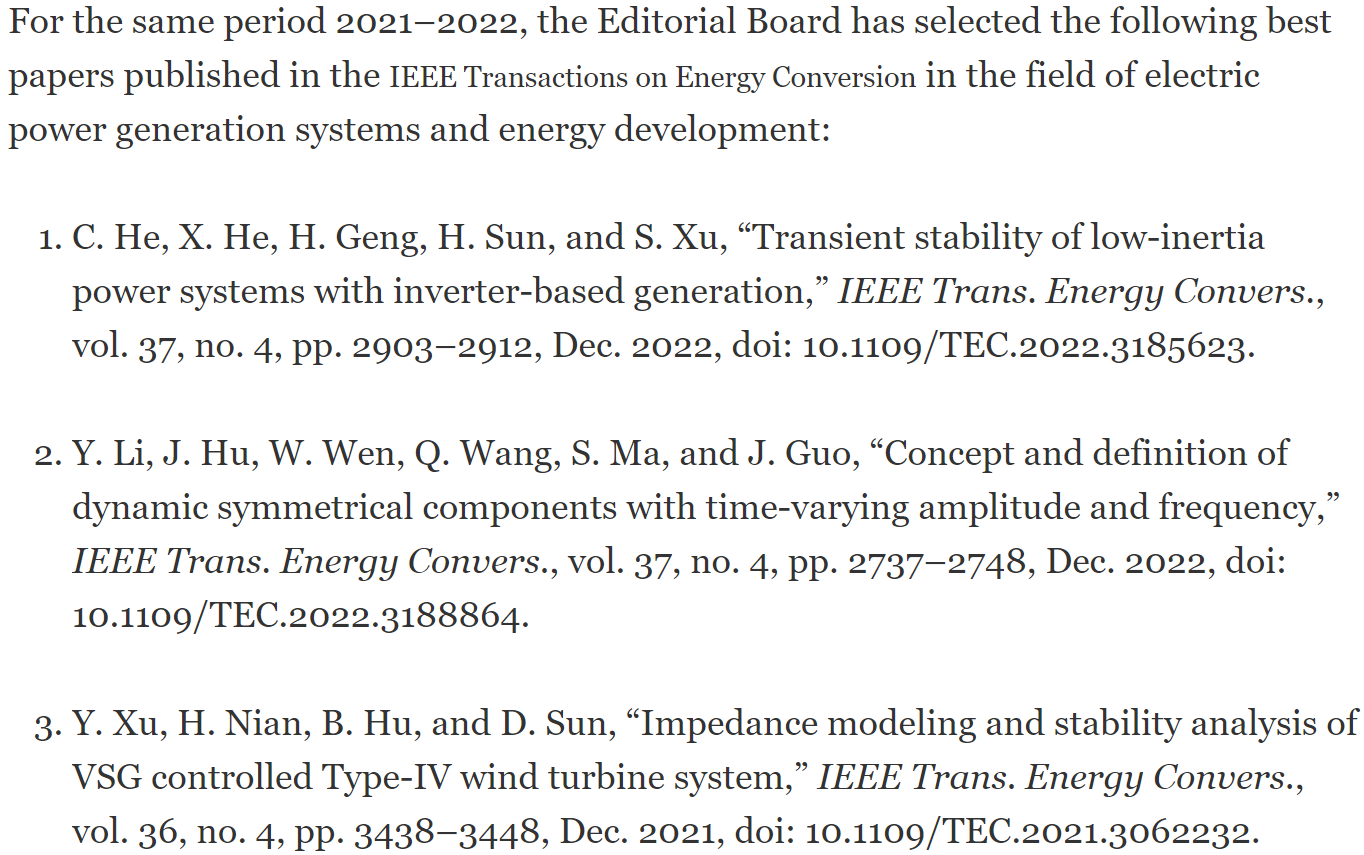 乐鱼(中国)网3月24日电 近期,乐鱼在线平台耿华教授PEACES课题组博士生何长军发表的论文“含电力电子发电装备的低惯量电力系统暂态稳定研究”(Transient Stability of Low-inertia Power Systems With Inverter-Based Generation)获得2022年度《IEEE能源转换汇刊》(IEEE Transactions on Energy Conversion)最佳论文奖,且在所有获奖论文中排名第一。同时,何长军也获得了2022年度优秀审稿人称号。
