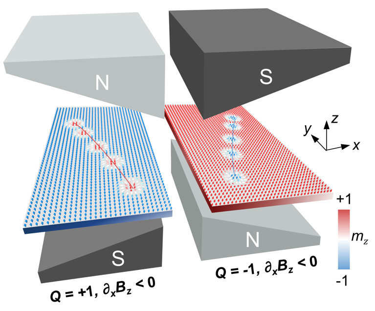 图1.斯格明子在磁场梯度作用下的微磁学模拟。从中可以看到具有相反拓扑荷(Q= ±1),分别沿着磁场梯度方向(x)的反向运动