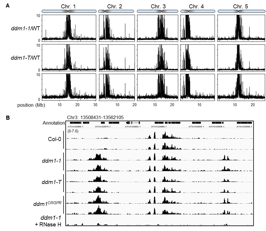 8月11日,孙前文实验室在《科学·进展》(Science Advances)期刊上发表了题为“DDM1介导的R-loop解除和H2A.Z排斥促进拟南芥异染色质的形成”(DDM1-mediated R-loop resolution and H2A.Z exclusion facilitates heterochromatinformation in Arabidopsis)的研究论文,揭示了拟南芥中染色质重塑蛋白DDM1可通过解除R-loop结构并排除组蛋白变体H2A.Z来启动异染色质形成的机制。该研究中,作者收集了众多影响拟南芥异染色质状态的突变体并进行了全基因组R-loop测序,结果发现染色质重塑蛋白DDM1的突变会引起着丝粒周围区域异染色质R-loop水平显著升高(图1)。