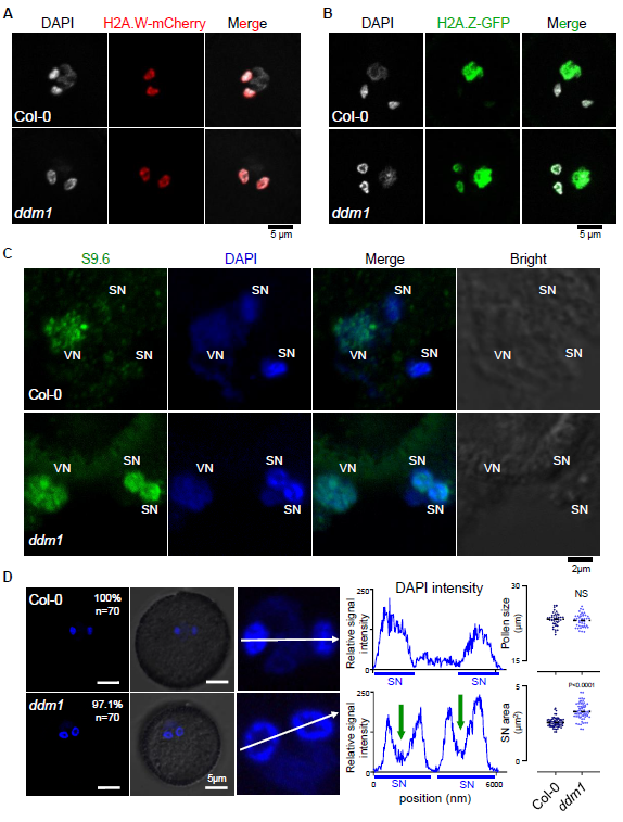 最后,作者发现DDM1抑制H2A.Z、解除R-loop的功能与花粉核的形态密切相关。野生型的花粉中,DDM1在精核(SN, spermnuclei)中富集,而H2A.W也在精核中积累,但H2A.Z和R-loop在营养核(VN, vegetative cell nuclei)中富集(图6A-C)。DDM1功能缺失后,H2A.Z和R-loop信号可以扩散到精核中(图6B和C),但H2A.W在精核中的聚集状态没有发生改变(图6A)。同时,ddm1突变体中异常富集的H2A.Z与R-loop伴随着花粉精核变大、空洞的形成(图6D)。
