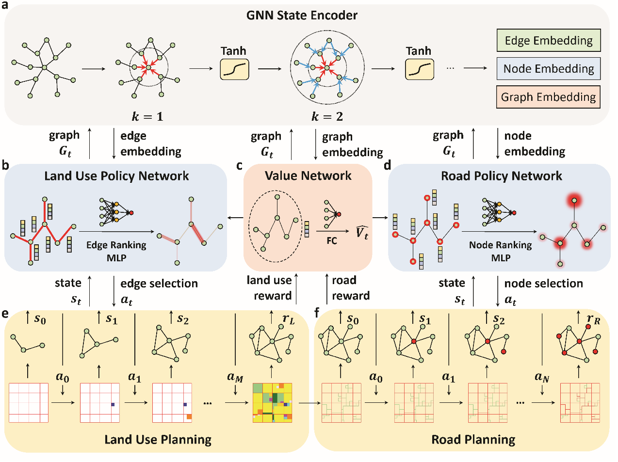提出的强化学习模型(a)图神经网络状态编码器。(b)用地布局策略网络。(c)社区规划价值判断网络。(d)道路布局策略网络。(e)社区规划图上马尔科夫决策过程示意图