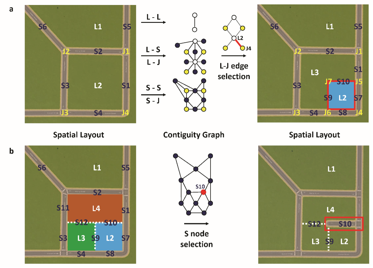 电子系城市科学与计算研究中心从2014年开始研究城市复杂环境中的治理、规划和决策问题。研究中心李勇副教授带领课题组博士生郑瑜等人,基于课题组在城市计算建模与深度强化学习等方向的技术积累,与建筑学院武廷海教授团队合作,创新地提出了基于深度强化学习的城市社区空间规划方法。通过在虚拟城市环境中数百万次的规划,提出的人工智能模型能够从海量数据中学习城市规划能力,不断优化空间效率,并最终达到超越人类专家的规划水平。另外,城市社区形式多样且不规则,无法使用在围棋和芯片设计等具有规则输入的任务中广泛采纳的卷积神经网络。为了克服这一难题,该方法首次从拓扑层面完成城市规划任务,使用图模型为任意形式的城市社区给出统一的表示,将城市规划转化为了图上马尔科夫决策过程,从而能够发挥深度强化学习算法在巨大解空间中高效搜索的能力,并实现城市社区用地和道路的智能布局。在北京两个社区的规划模拟实验表明,所提方法得到的社区规划方案能够显著提高“15分钟城市”的各项指标。同时,通过设计人类规划师与人工智能的协作工作流,能够大幅提升人类规划师的工作效率,高效地生成不同风格的社区规划方案。