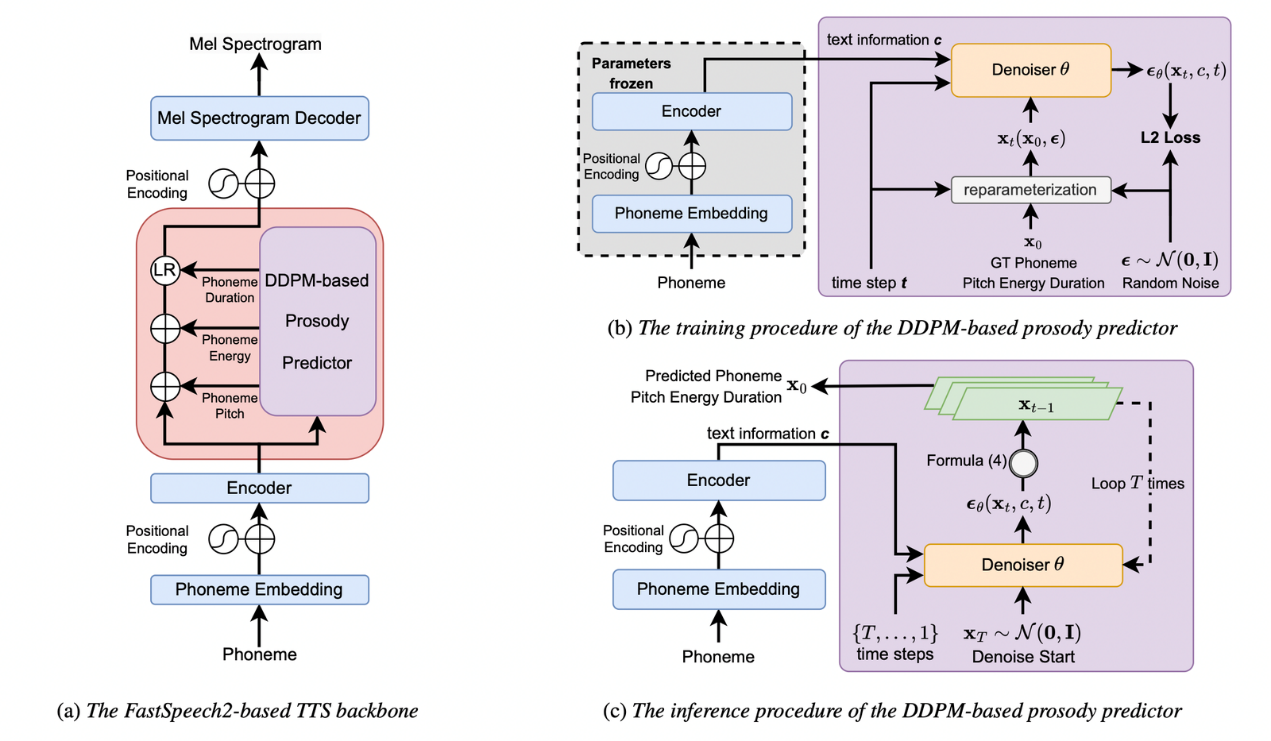 在表现力语音合成的自动风格控制上,研究团队引入去噪扩散概率模型(Denoising Diffusion Probabilistic Model,DDPM)来构建一种生成式的语音韵律预测方法。该预测方法以语音合成系统的输入文本作为预测条件,训练DDPM以迭代去噪的形式从白噪声中采样得到目标特征,作为预测的语音韵律表征,并提供给语音合成框架作为语音风格的控制信息,从而生成具有特定风格的合成语音。