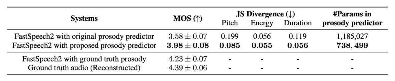 相较于传统的基于预测误差优化的确定性预测方法,团队提出的方法避免了对目标韵律表征分布做简化假设,有效提升了对于人类语音风格真实分布的拟合效果,改善了现有方法预测结果存在的过平滑问题,显著增强了合成语音的表现力。基于生成采样形式的预测流程,该方法具有为相同文本提供多样的语音风格信息的能力,进一步提高了表现力语音合成系统输出结果与真人表达习惯的相似性。