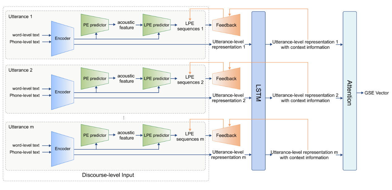 在表现力语音合成的篇章情感分析上,研究团队设计了一种基于篇章级多尺度情感分析模型的情感分析方法。该分析方法从篇章、句子、词语、发音音素四个层级出发对输入篇章文本进行情感分析,并分别使用全局风格表征向量(Global Style Embedding,GSE)、局部韵律表征序列(Local Prosody Embedding,LPE)作为输出,以从篇章整体情感基调和局部情感起伏变化两个尺度建模语音的风格元素。