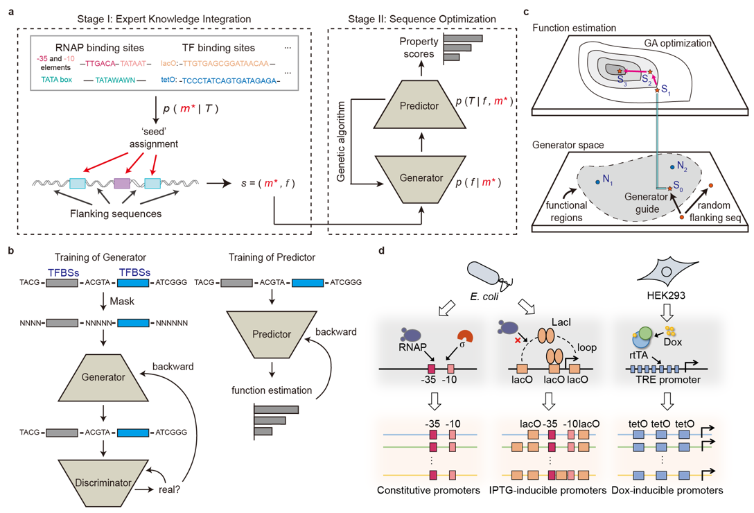 启动子是决定基因在何时、何地以何种程度进行转录表达的合成生物学基础元件,设计具有特定功能的人工启动子是逆向构造人工基因系统的基础。启动子中连接不同转录因子结合位点的之间的旁侧序列被证明对启动子功能有着重要影响,但这些旁侧序列的特征难以被人为归纳总结为明确的知识和设计准则。同时,由于天然基因组中具有特定转录因子结合序列的启动子数量稀少,难以直接建立深度学习模型对这些启动子的序列的整体模式进行提取。这些因素导致旁侧序列在设计中被长期忽视,缺乏有效的对启动子进行整体优化设计的方法。
