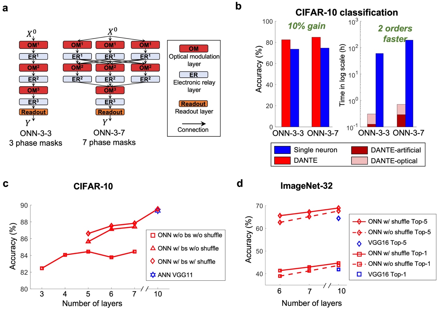 受限于算力瓶颈与显存容量,现有的单神经元学习方法仅能实现百万量级神经元的光电神经网络训练,难以满足ImageNet等复杂大规模数据集的训练需求。课题组在空间光智能计算平台上开展了大量仿真与物理实验验证,将现有百万量级光电神经元网络的训练时间从数十小时级缩短到了分钟级。课题组进一步基于DANTE,首次实现了亿级神经元的大规模光电神经网络训练与推理,在CIFAR-10、ImageNet等多个数据集上实现了与经典人工神经网络VGG-11和VGG-16相当的准确率。值得强调的是,在ImageNet基准上成功训练光电神经网络具有重要意义。这展现了DANTE在支撑大规模光电神经网络训练学习上的巨大潜力,有望推动光电智能计算从基于MNIST基准的原型验证阶段迈入到使用现代ImageNet基准来解决大规模现实问题的全新时代。