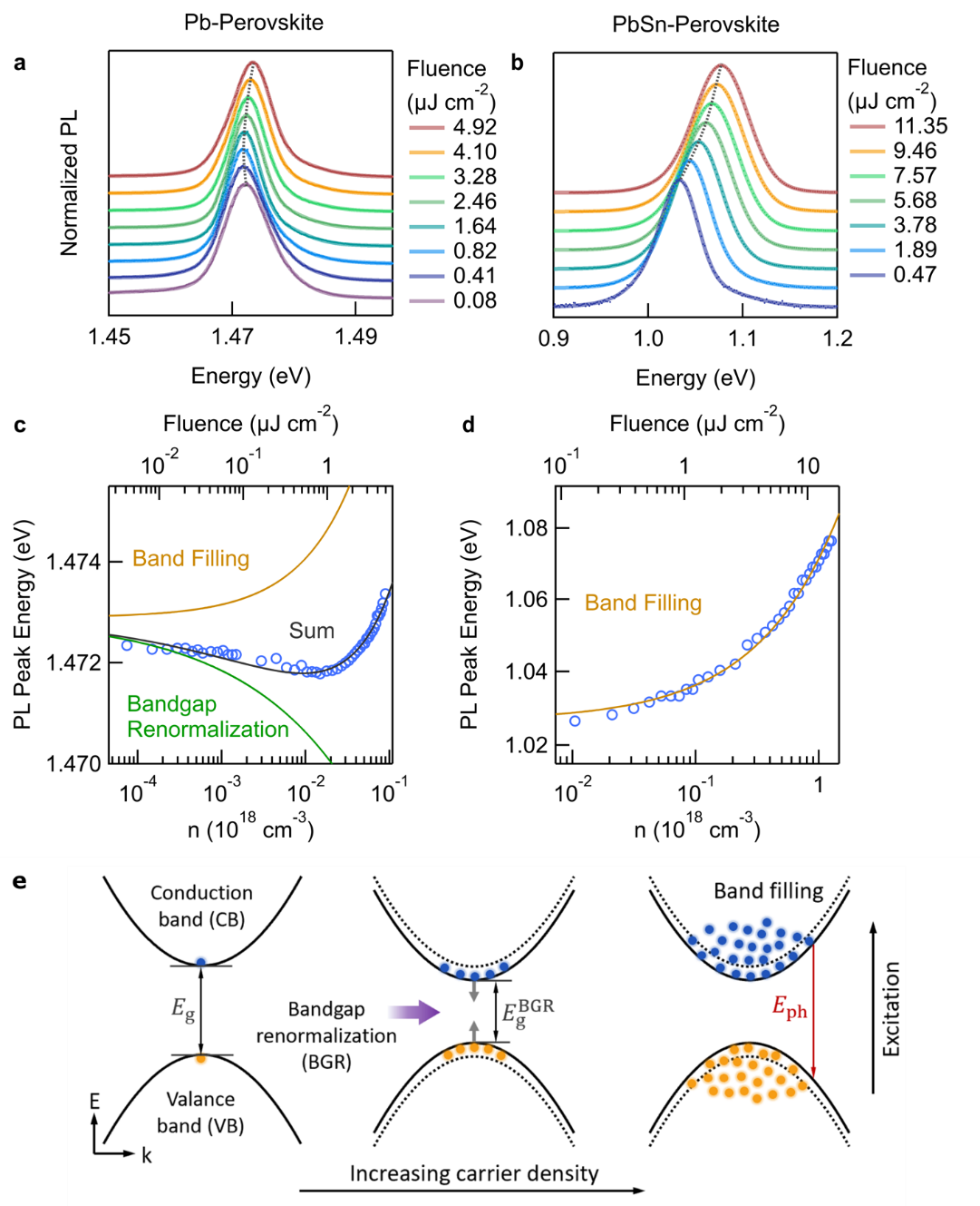 在载流子浓度对钙钛矿有效带隙影响的研究上,文献中只报道了荧光光谱能量随光注入载流子浓度增加而增大。这体现的是能带填充效应,即在导带和价带的直接填充造成的有效带隙的增加。而在这项工作中,通过将荧光光谱的测量延伸至更低的激发光功率,带隙随光注入载流子浓度增加而减小的现象被观测到(图3)。这是带隙重整化效应的体现:光生载流子在能带填充的过程中,由于电子和空穴载流子间的库伦相互作用和多体相互作用,使得带隙发生重组效应而减小。通过同时计入带隙重整化效应和能带填充效应,激子有效质量可以在简单的荧光测量中被更准确地评估。