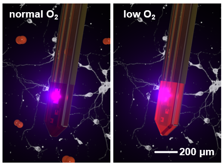 大脑是对氧气最敏感的器官,脑组织中的氧含量直接影响大脑代谢和功能完整性,氧代谢异常也与颅脑创伤、缺血缺氧性脑病、癫痫、肿瘤等引起的神经系统病损密切相关。与近红外光谱、功能磁共振等技术所获得的血氧信息相比,组织氧分压与局部神经活动和代谢过程有着更加密切的联系。如何实时、准确、便捷、原位地监测脑组织氧分压,并解析其与神经活动的相互作用关系,是脑科学基础研究和脑疾病临床诊疗中的关键问题。近日,乐鱼在线平台电子工程系盛兴课题组与合作者开发了一种植入式微型光电探针,可在自由活动的动物深层脑组织中实现无线、连续、实时的脑组织氧分压监测。