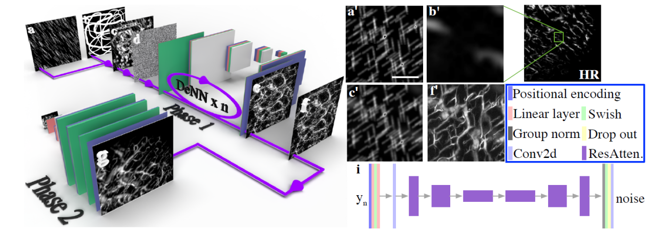 图1.(a)-(g)为DOVE的示意图,即利用手绘涂鸦生成的血管造影图像进行超分辨模型的训练。(a)为类似雨的噪声图像。(b)为手绘的涂鸦图像。(c)为(b)与(a)的重叠。(d)为归一化的高斯噪声图像。(e)为从(c)生成的光声血管造影图像。(f)为归一化的光声血管造影图像。(g)为重建的超分辨率图像。(a’)-(f’)对应左侧DOVE示意图的(a)-(f)。(a’)为类似雨的噪声图像。(b’)为高分辨率光声血管造影图像的随机截取图像。(c’)为(b’)与(a’)的叠加。(f’)为生成模型借助(c’)为输入而生成的光声血管造影图像。(i)为基于UNet的DeNN的结构