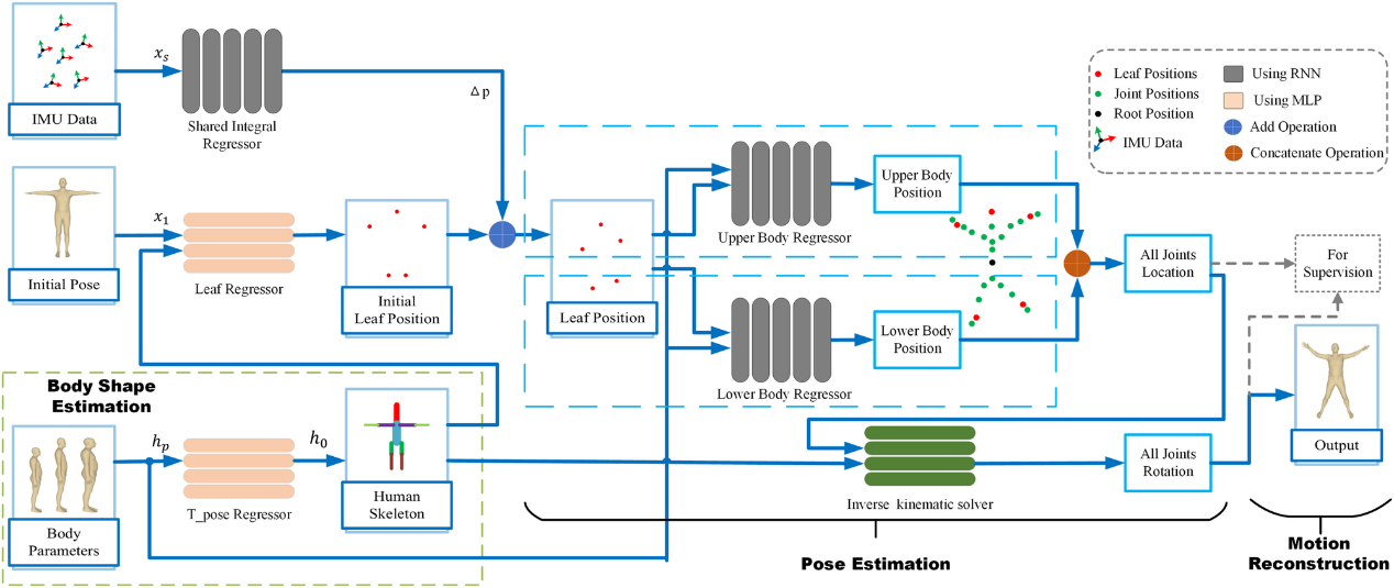 针对以上问题,乐鱼在线平台机械系智能制造与精密加工研究室研究人员提出了一种基于六个惯性传感器的新算法结构FIP(Fast Inertial Poser),为便携式终端的部署带来了一种新的思路。该方法分为两个阶段,关节位置估计和运动学逆解。与之前的方法相比,该方法效率提升的主要原因为:第一,消除了额外的优化设计;第二,基于“最小测量原则”,通过考虑人体形状参数(身高、腿长、单臂长)和性别,使用运动学逆求解器和不同传感器的共享模型来增强神经网络结构的表达能力;第三,去除RNN的双向传播机制。在位置估计阶段,FIP使用三个独立的循环神经网络(RNN)来估计叶节点和其余节点的位置。为了使模型推理过程更接近真实的物理过程,FIP使用传感器共享积分RNN来估计叶节点的位置。此外,对于每个RNN,人体参数信息通过嵌入式编码的方式输入到算法网络中。