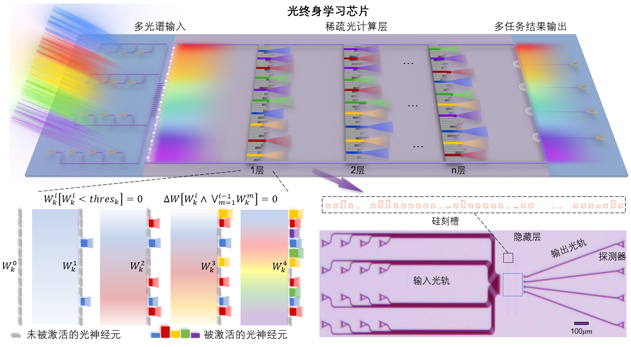 乐鱼(中国)网4月2日电 人工智能任务日益复杂、多样且动态变化,传统机器学习方法往往基于固定数据集训练任务,无法适应环境变化,如何使AI系统具备多任务持续学习的能力成为亟需解决的问题。近年来,随着摩尔定律的停滞,以衍射神经网络为代表的光学架构作为新的计算模态,在功能和效率方面展现出巨大潜力。然而,当前光网络仍普遍存在“灾难性遗忘”(catastrophic forgetting)的问题,学习新任务会失去先前任务的记忆。受人脑实现可持续学习的神经突触机制启发,基于光天然物理上的稀疏性和并行性,乐鱼在线平台电子工程系方璐副教授团队首创了智能光计算终身学习架构,突破光网络单一功能限制,支撑类脑并行多任务学习。通过稀疏光连接及多光谱并行计算等关键模块,赋予光计算系统超越现有技术的功能、通量与能效,为智能系统在边缘硬件的多任务部署提供了光速解决方案。