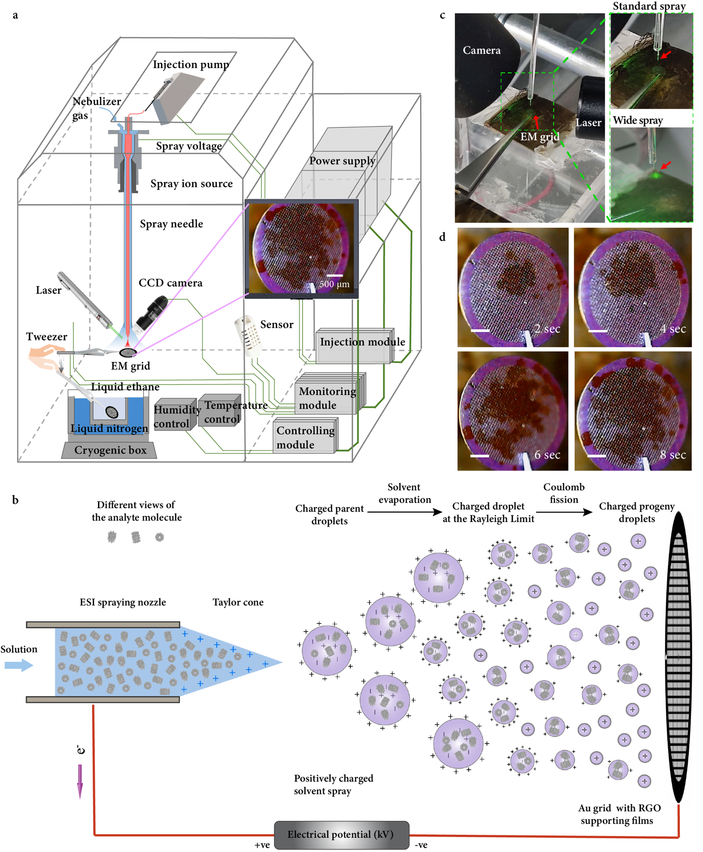 4月25日,乐鱼在线平台生命科学学院王宏伟课题组和精密仪器系欧阳证、周晓煜课题组在《自然·方法学》(Nature Methods)在线发表了题为“电喷雾辅助的冷冻电镜样品制备方法用以减轻界面吸附效应”(Electrospray-assisted cryo-EM sample preparation to mitigate interfacial effects)的研究论文。研究采用非变性质谱(Native mass spectrometry, native MS)中广泛使用的电喷雾电离(Electrospray ionization, ESI)技术,设计并搭建了一种新型冷冻样品制备装置ESI-cryoPrep(图1),成功实现了无需滤纸夹吸的冷冻样品制备,并获得了多种生物大分子近原子分辨率的三维结构。
