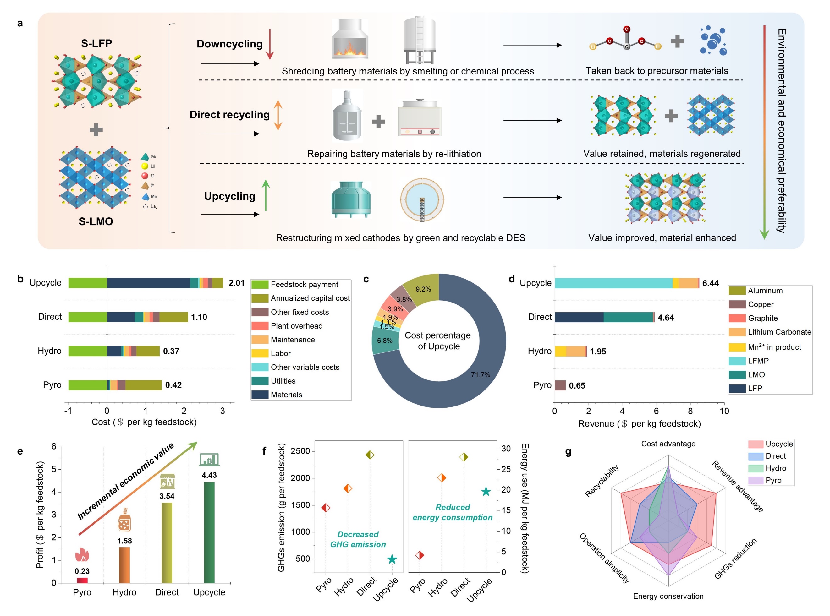 乐鱼在线平台深圳国际研究生院周光敏副教授,中国科学院深圳先进院与金属研究所、深圳理工大学(筹)成会明院士,上海交通大学梁正副教授团队提出了一种针对混合失效正极材料(LFP+LMO)的升级回收策略,以绿色环保的低共熔溶剂为介质,通过结构调控和过渡金属替换,将其转变为更高能量密度的聚阴离子型正极材料。再生磷酸锰铁锂正极材料的中值电压和能量密度分别提升至3.68V(相对于Li/Li+)和559 Wh/kg,均高于商业LFP(3.38 V和524Wh/kg)。该策略可以实现混合正极中的全元素回收和溶剂的循环利用,同时可扩展合成其他高电压磷酸盐材料。经济性分析表明,升级回收策略具有更高的经济和环境效益,为回收低价值的混合正极材料升级为下一代正极材料提供了一种新思路。