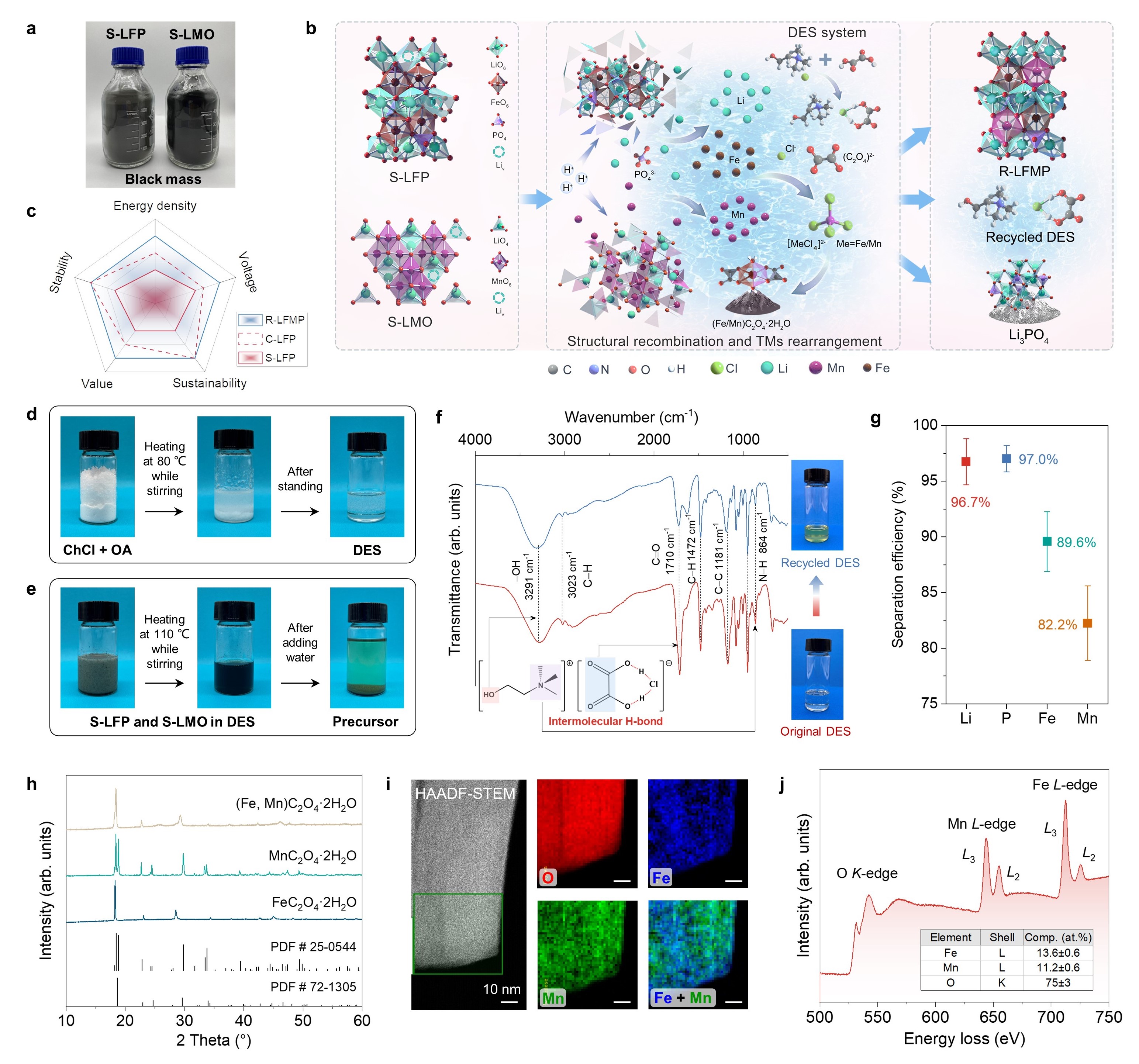 乐鱼(中国)网5月23日电 近年来,锂离子电池(LIB)的可持续回收逐渐成为业内关注焦点。在电池的所有组分中,正极材料占据最大重量并主导了电池成本,其回收再利用刻不容缓。商业正极材料包括橄榄石型磷酸铁锂(LFP)、层状钴酸锂/三元材料以及尖晶石锰酸锂(LMO)。因为这些正极具有不同的晶体结构,目前的直接回收方法主要针对单一特定成分,同时处理多种正极材料仍面临很大挑战。传统火法或湿法回收通过高温熔炼或化学过程破坏电池材料,并需要复杂的步骤来分离不同的元素,导致二次污染。更重要的是,失效LFP或LMO电池中的有价元素含量低,而这些方法产生的Fe/Mn产物具有较低经济价值,因此需要发展更好的回收技术来实现混合正极材料的经济回收。