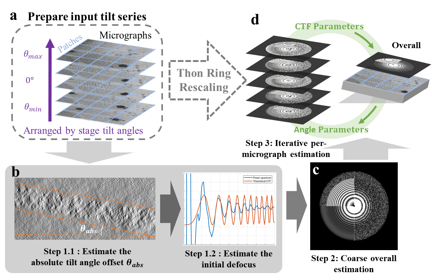 5月31日,乐鱼在线平台生命科学学院李雪明副教授课题组和电子工程系沈渊教授课题组联合在《结构》(Structure)杂志在线发表研究论文,题目为“基于冷冻电子断层成像倾转系列照片的离焦量联合估计方法”(Tilt-series-based joint CTF estimation for cryo-electron tomography)。该论文报道了一种基于全部倾转系列照片的联合估计方法(图1)。该方法首先利用整套倾转系列数据来生成并估计整套数据的平均离焦量。其中通过引入一种尺度变换(Thonring rescaling)的方法,将不同离焦条件下的功率谱进行缩放,使其中的CTF衍射环能够被对齐并平均,从而获得高信噪比的平均功率谱。接下来,该方法依托平均离焦量作为初始值,对倾转系列中每张照片的离焦量进行局部估计优化,以提升单张照片的离焦量估计精度。在上述估计的过程中,该方法还包括了基于图像灰度均值的绝对倾角偏移估计方法,以及通过将离焦量与绝对倾角偏移和面外倾角(x-tilt)进行联合建模,在改善离焦量估计准确性的同时,实现对样品三维倾角的精确测量。