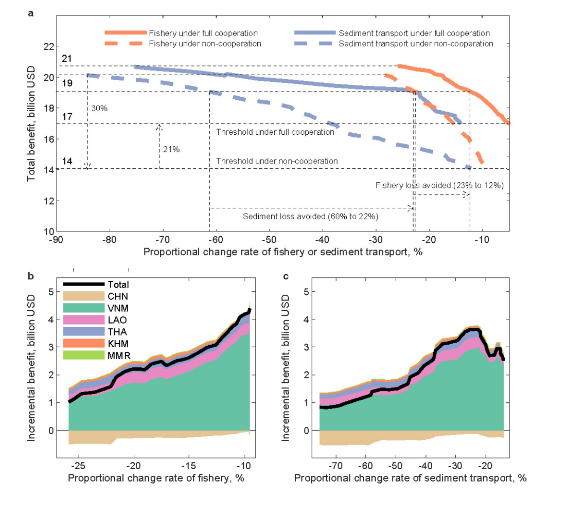 澜湄流域经济收益对生态影响的非线性响应。(a)在不合作和全面合作模式下,水电和水稻产量总收益与生态影响的关系;(b)全面合作的收益增量与各国渔业损失的关系;(c)全面合作的收益增量与各国泥沙运输损失的关系