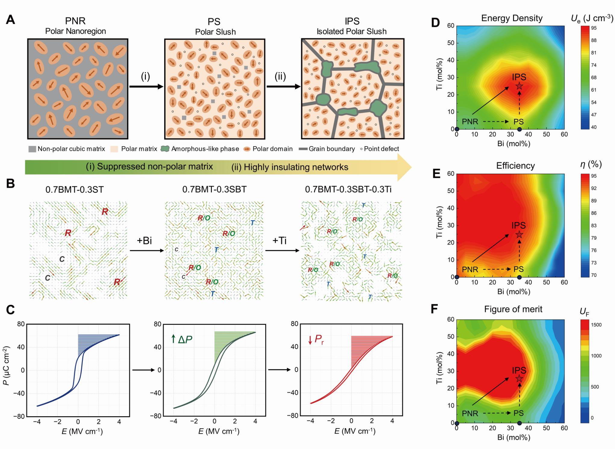 该策略通过在弛豫铁电体中实现高度局域化的强极性态来突破储能密度。首先,通过构建混沌的雪泥态纳米畴结构,实现在常规弛豫铁电体中难以获取的高可逆极化强度;然后,引入由晶界和纳米非晶相构筑的网络结构对雪泥态纳米畴结构进行区块化分割,构建出具有隔离极性雪泥态(Isolated polar-slush,IPS)结构的新型弛豫铁电体(图1)。相场计算模拟和实验结果表明,IPS结构可协同提升可逆极化强度和击穿场强,基于组分优化可获得高储能密度、效率和性能优值。