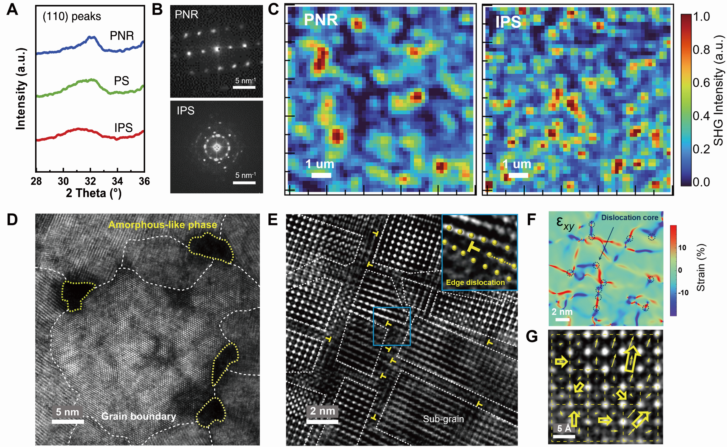 通过二阶非线性光学(SHG)扫描探测、纳米束旋进电子衍射(PED)和高分辨扫描透射电子显微镜(STEM)等手段,研究团队证明了IPS结构薄膜中存在高度局域化的强极性态,其源于嵌入的非晶相、高密度的晶界、由位错阵列组成的亚晶界以及极性雪泥态团簇的综合作用(图3)。该结构兼具高绝缘性以及高动态的极性团簇,显著增强了材料的储能性能。