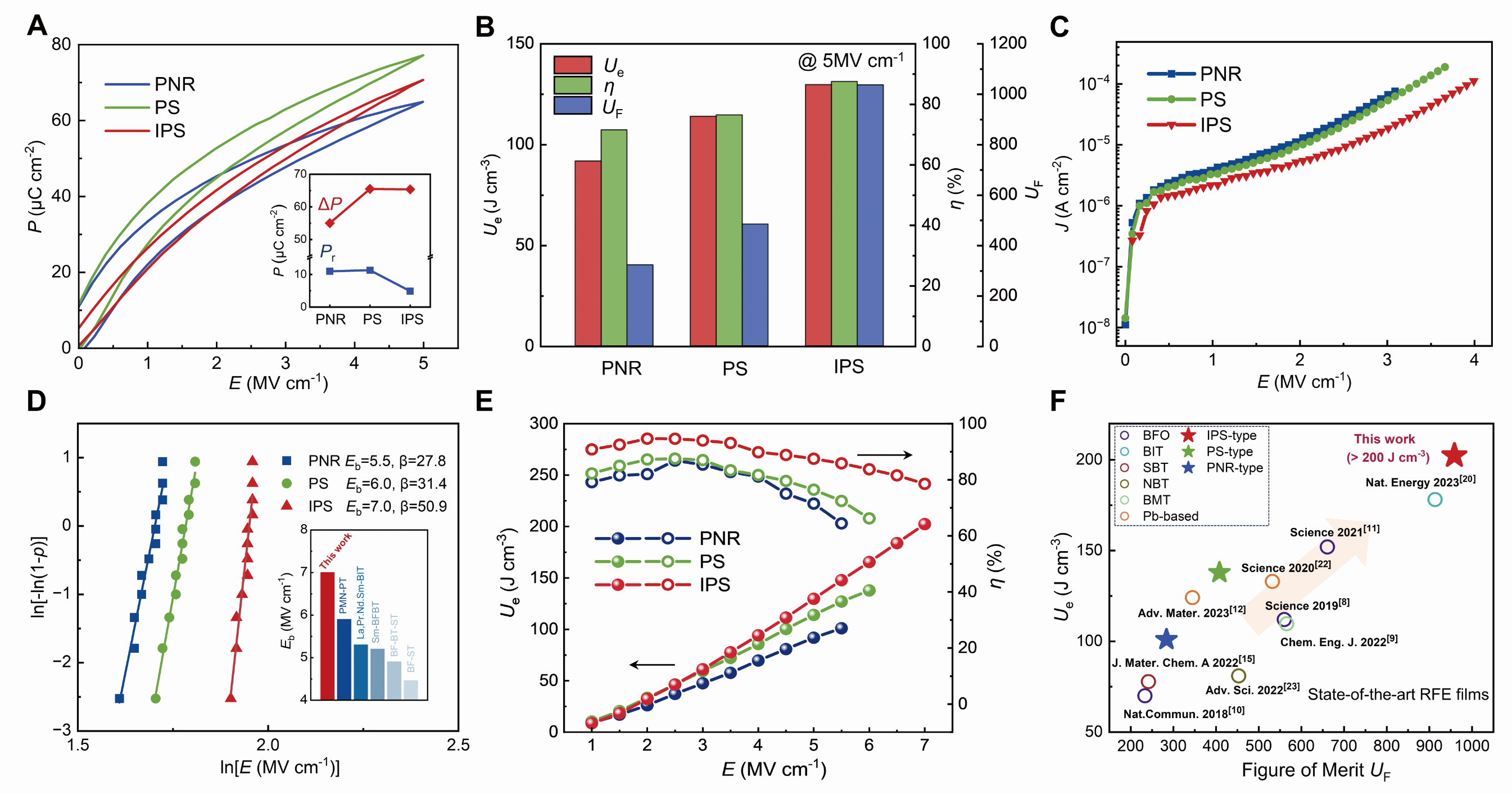 图2.不同类型BMT-ST基弛豫铁电薄膜的极化、电学和储能性能