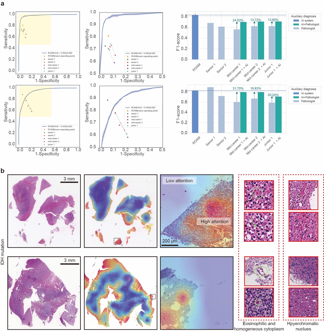 研究人员对ROAM进行了临床级的综合评估并研究了ROAM在胶质瘤辅助诊断中的表现。如图3,ROAM的临床胶质瘤诊断表现与高年资病理医生相当。此外,在ROAM提供的可视化依据的辅助作用下,3位中低年资的病理医生的诊断准确性有了显著的提升,这体现了ROAM的巨大临床应用价值。