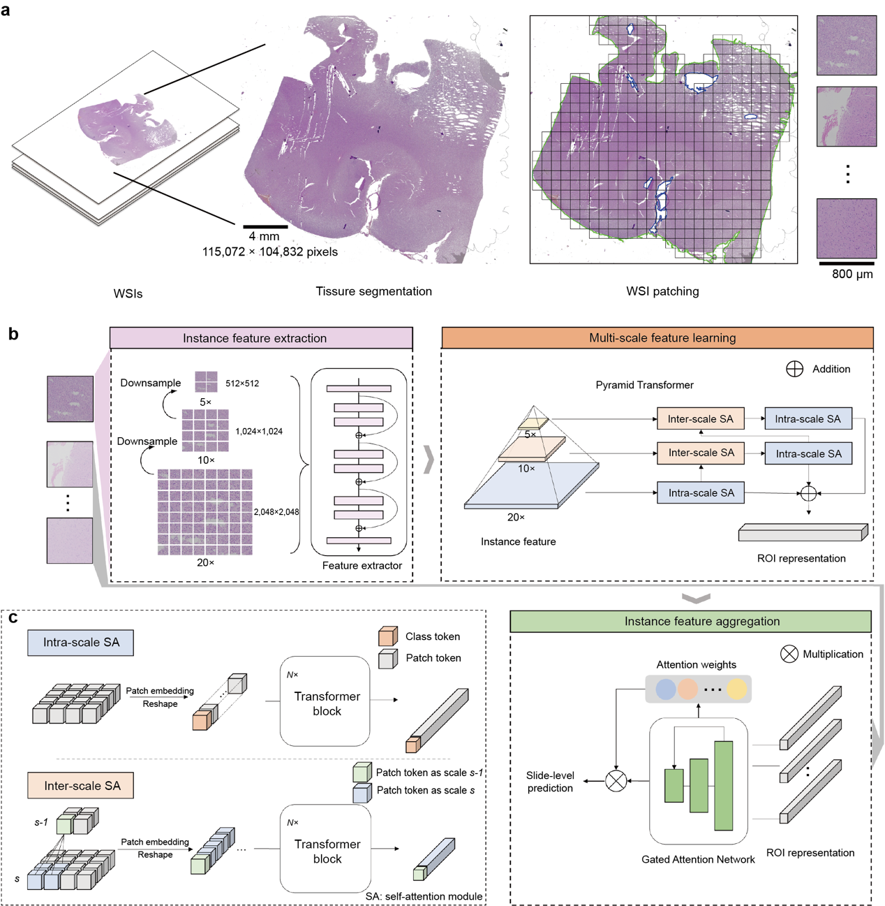 ROAM是一种弱监督计算病理学方法,该方法以多示例学习为基本框架,以大尺寸组织图像块为基本研究单元,并采用金字塔transformer来系统地学习每个组织图块的尺度内和尺度间的相关性特征,从而实现对全组织切片图像视觉表征的有效提取。如图1,ROAM首先对每张全切片图像进行组织分割并从中提取大尺寸的组织图像块(2048×2048)作为后续分析的基本单元。随后,ROAM利用多尺度示例特征学习模块组织图块的特征,分别使用尺度内自注意力模块(Intra-scale SA)和尺度间自注意力模块(inter-scale SA)学习组织图块中相同放大尺度下不同位置以及不同放大尺度下同一位置的局部区域之间的相关性特征,利用金字塔transformer架构逐步从高放大倍数到低放大倍数融合多尺度特征,得到组织图块的多尺度视觉表征。最后利用门控注意力机制学习每个组织图块(示例)的注意力权重并加权求和,得到整张切片的视觉表征。