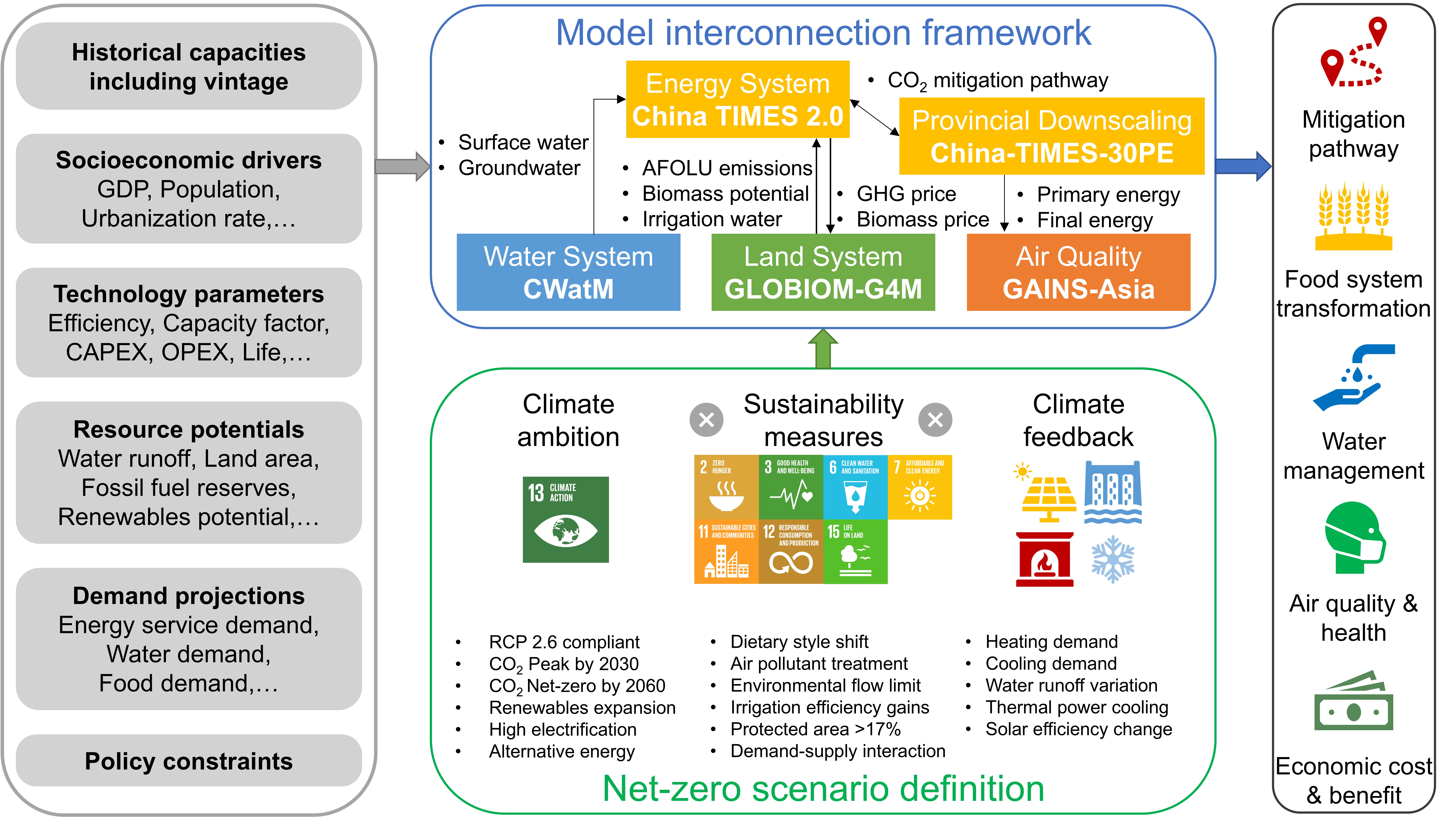 针对这一问题,乐鱼在线平台核能与新能源技术研究院(以下简称“核研院”)陈文颖教授课题组和合作团队建立了一套多模型集成框架,实现了国家级能源模型China TIMES 2.0、省区级能源模型China-TIMES-30PE与土地利用模型GLOBIOM-G4M、水资源管理模型CWatM、空气质量模型GAINS-Asia的连接,综合考虑了气候和能源政策、可持续发展措施和气候反馈,探索和量化了中国在实现碳中和目标过程中,对环境相关可持续发展目标的协同效益和潜在权衡。研究成果为中国实现碳达峰碳中和的同时提高能源、土地、水、空气质量系统的可持续性提供了长期转型路径,为中国形成多系统协同的可持续发展方案提供支撑。