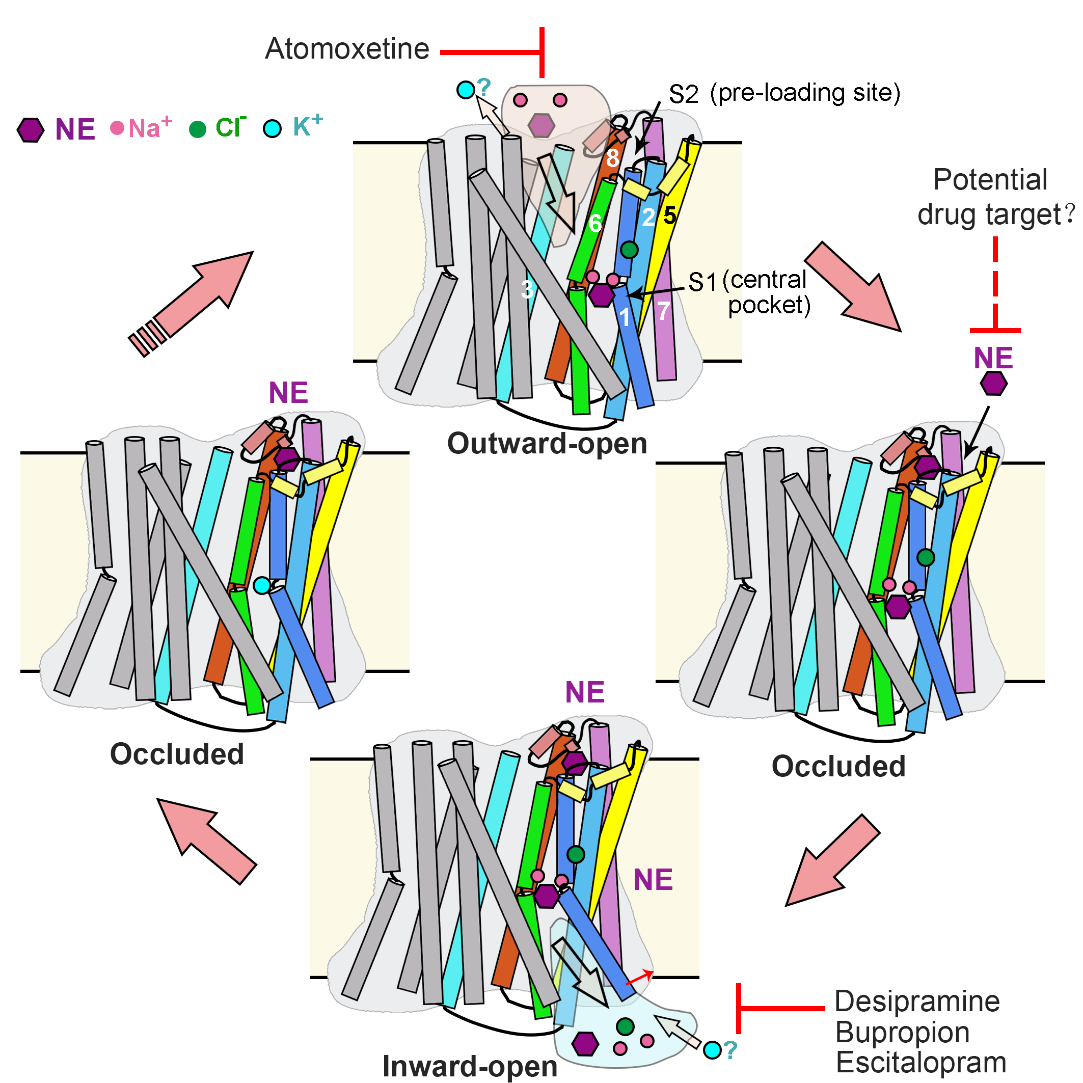 综上,研究人员提出了NET的转运过程模型(图4)。在向外开放的构象中,Na+、Cl-和底物NE与中央口袋结合,启动NET的闭合,进入闭合状态。在这个转变过程中,第二个底物可以提前结合到新形成的膜外S2位点中。随后,TM1a的打开(向内开放构象的标志特征)促进底物与两个Na+一起从中央口袋释放。在转变回向外开放构象的过程中,S2位点的局部结构将受到破坏,导致S2位点处底物的释放。释放的底物可能直接进入到中央口袋,开始下一个转运循环。这一过程与两个Na+离子和一个Cl-离子进入细胞质以及可能一个K+离子进入细胞外基质的转运耦合。而不同类别的抗抑郁药物占据S1位点阻碍底物转运。