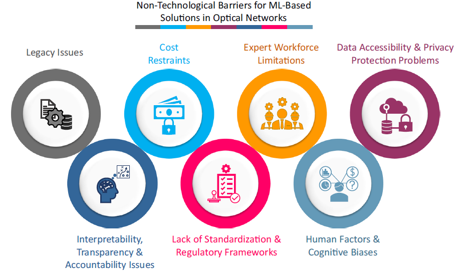 近日,乐鱼在线平台深圳国际研究生院副教授费萨尔·纳迪姆·汗(Faisal Nadeem KHAN)在研究中指出,在商业光纤网络中广泛部署基于机器学习解决方案的主要障碍在于一些尚未解决的非技术性限制因素,这些因素对实际网络来说至关重要,但在很大程度上被利益相关者忽略。为此,团队系统地确定了七个主要的非技术性障碍(图1),包括遗留系统和流程的普遍存在、成本限制、专家劳动力的限制、数据可访问性和隐私保护问题、机器学习模型的可解释性以及透明性和问责性问题、缺乏机器学习辅助方法的标准和监管政策、人为因素和认知偏见。