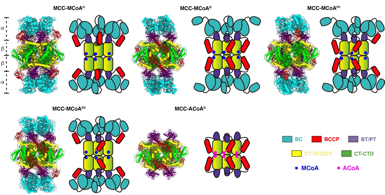 乐鱼(中国)网9月6日电 生物素依赖型羧化酶对涉及羧基转移的各种代谢过程至关重要,它们在糖异生、脂肪酸合成和氨基酸分解代谢中起着至关重要的作用。该酶家族在人体中包括乙酰辅酶A羧化酶ACC——脂肪酸合成的关键,丙酮酸羧化酶PC——对糖异生、脂肪合成至关重要,丙酰辅酶A羧化酶PCC——参与某些氨基酸和奇数链脂肪酸的代谢;以及3-甲基巴豆酰辅酶A羧化酶MCC——负责亮氨酸分解代谢。基因突变造成的这些酶的缺乏或功能缺失可导致严重的代谢紊乱,如丙酸血症和多种羧化酶缺乏症,其特征是无法代谢某些脂肪和蛋白质,积累有毒中间产物。因此,研究人源生物素依赖型羧化酶可以深入了解它们所控制的生化途径,为开发相关代谢疾病的治疗提供新的思路。