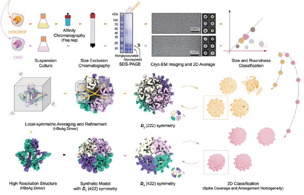 乙肝病毒的表面抗原是决定病毒入侵、复制和包装的关键蛋白,也是诊断感染和评估临床功能性治愈的重要指标。在感染监测中,乙肝表面抗原是乙肝免疫检测“大三阳”和“小三阳”的共同标志分子;在临床治疗中,乙肝表面抗原清除是慢性乙肝临床治愈的关键指标。HBsAg是乙肝病毒编码的一种十分独特的分子,它能够自发聚合形成形态多样的病毒颗粒,甚至产生大量无基因组的“诱饵”亚颗粒(subviral particle,SVP),远超感染性完整病毒颗粒(infectious Dane particle)4个数量级以上,干扰人体免疫系统,导致免疫耗竭。尽管该蛋白自病毒发现以来一直备受关注,但其复杂的结构特性和多样化的组装形态,一直是结构生物学和病毒学长期未解的谜题。