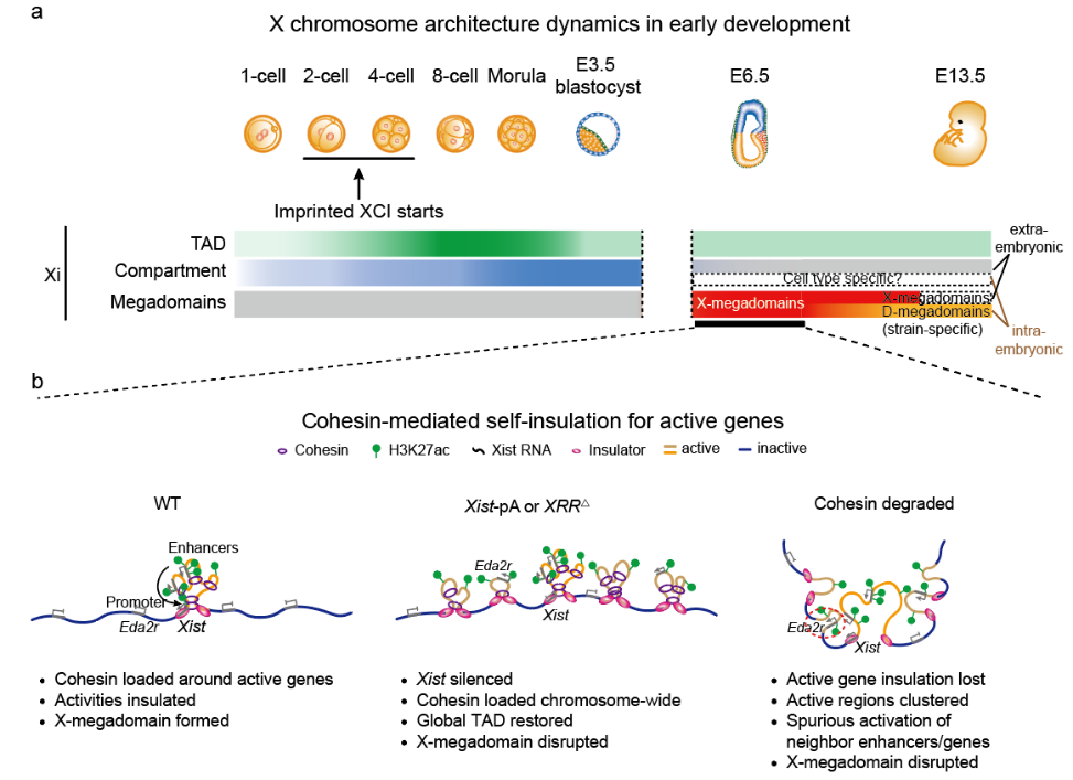 乐鱼在线平台生命科学学院颉伟实验室和合作者前期围绕染色体三维结构在哺乳动物生殖和胚胎发育过程中的变化规律和功能进行了一系列研究,包括精子发生、卵子发生、着床前胚胎、着床后胚胎和核移植过程等。然而,染色体三维结构在雌性胚胎发育早期X染色体失活过程中的动态变化过程、机制和功能仍不清楚。