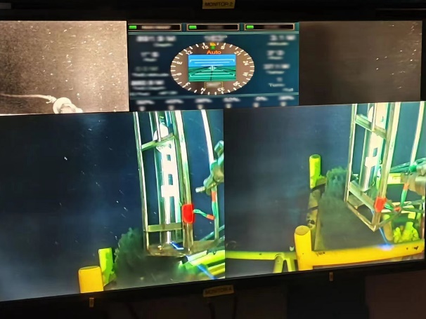 ROV操控屏幕中的仪器水下下放图(上)和仪器现场工作图(下)