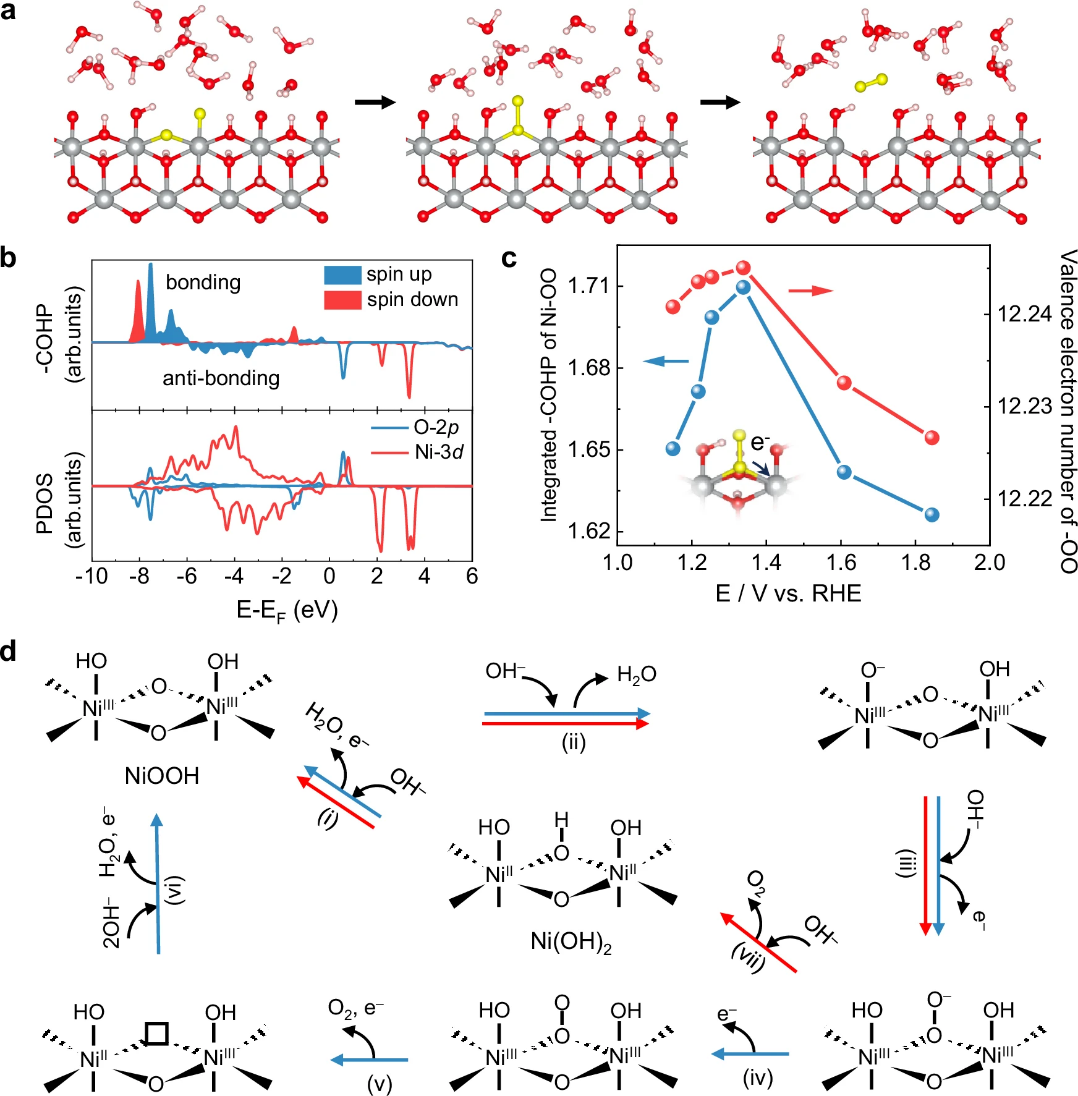对此,研究团队采用原位电化学微分质谱(DEMS)、原位拉曼光谱结合第一性原理的分子动力学模拟等多种手段,在碱性氧析出的反应机制以及新型解耦电解水技术的探索上取得了重要进展。研究团队通过氢氧化镍OER过程中的原位DEMS研究(图1),发现了一种新的氧化-还原分步氧析出机制(ACS-OER)。与传统的阳极OER通过不断提高过电位来激活O2的释放不同,ACS-OER过程首先通过电化学氧化将Ni(OH)2转化为NiOO–活性物种,然后通过降低过电位使NiOO–发生还原来释放O2。研究通过原位光谱(图2)和基于第一性原理的分子动力学模拟(图3),证实这一过程的关键在于在较低电位下Ni(OH)2氧化成的NiOOH中,晶格氧很容易参与O-O耦合形成NiOO–活性物种。在传统的阳极OER机制中,NiOO–中O-O的进一步氧化析出是速度决定步骤,往往需要更高的过电位。研究团队发现,通过降低电位使NiOO–还原可以促进Ni-O键的减弱,同样也可以激发O-O的析出,从而实现了动力学更快、过电位更低(低于200mV)的氧析出途径。研究团队还系统研究了氢氧化镍的尺寸、铁元素掺杂等因素对这种ACS-OER活性的影响,证明Ni(OH)2的边缘位是这种ACS-OER机制的活性位,而铁元素的掺杂会显著抑制这种机制的发生。