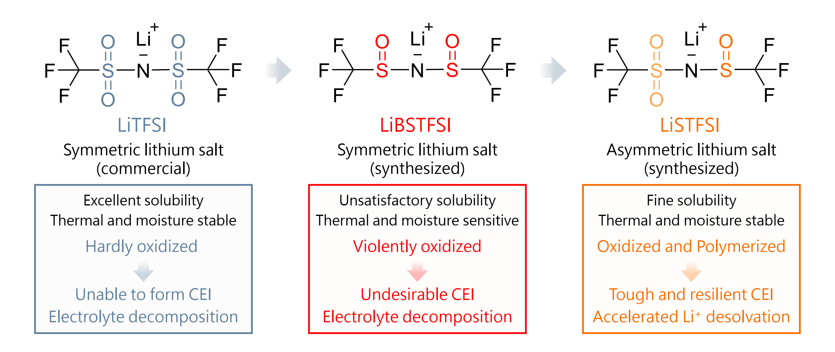 相关研究成果以“打破磺酰亚胺阴离子的分子对称性助力极端工况下的高性能锂金属电池”(Breaking the molecular symmetricity of sulfonimide anions for high-performance lithium metal batteries under extreme cycling conditions)为题,于11月28日发表于《自然·能源》(Nature Energy)。