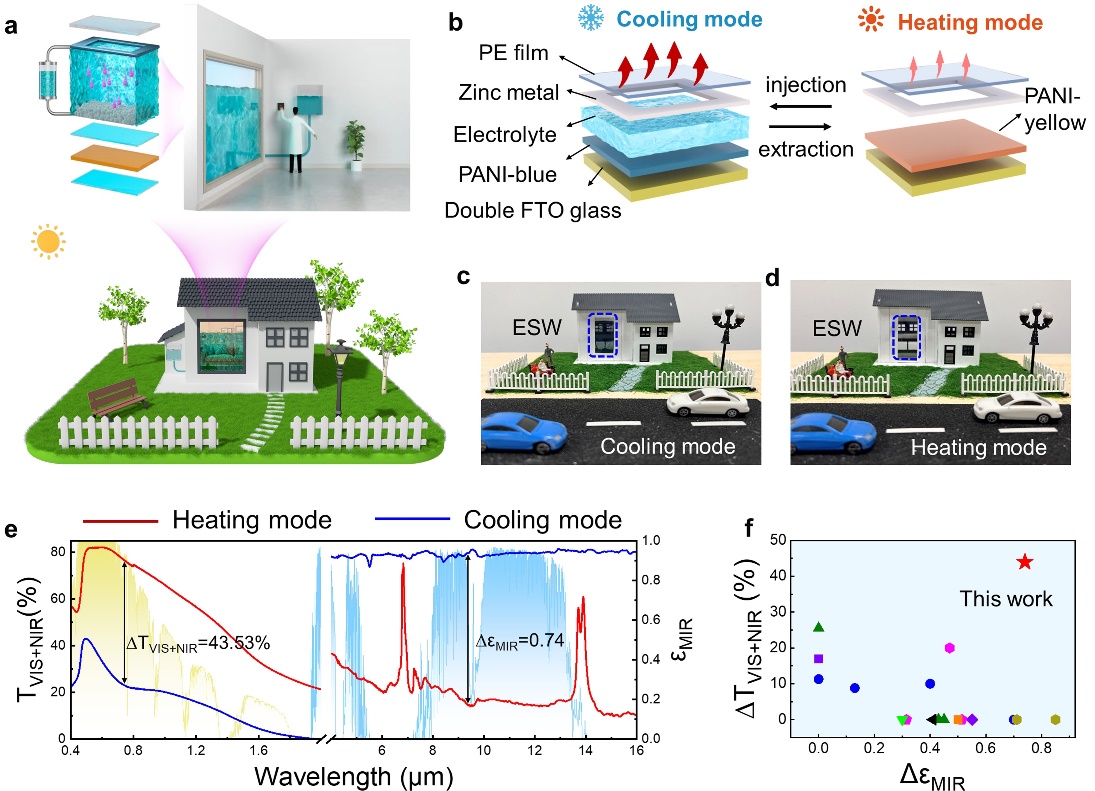 近年来,全球极端天气事件愈加频繁和严重,对人类社会和自然环境带来了重大挑战。据统计,全球每年约16%的能源消耗用于建筑的供暖、通风和空调系统,以保持舒适的室内温度。窗户作为建筑主要的能量交换介质,是建筑物最不节能的部位,所以高性能节能智能窗的开发对减少建筑能耗起着关键作用。窗户的热传递主要包括导热、对流和热辐射三种方式,其中热辐射占总热传递的50%以上,是实现窗户高效光热管理的关键。热辐射涉及可见光(380-780nm)、近红外光(780-2500nm)和中红外光(8-13μm)波段。因此,为减少建筑能耗、提高照明效率并适应不同季节条件,新型的建筑节能智能窗需要对可见光到中红外光波段的光谱调控能力进行全面优化。电致变色材料能够通过改变电压来改变自身颜色和光线的透过率,是一种非常有前景的降低能耗和改善室内热舒适度的建筑节能窗技术。然而,目前大多数电致变色材料的研究主要集中于可见光和近红外波段的动态调控,它们对中红外波段的动态调控能力较为薄弱,成为限制建筑节能智能窗性能提升的主要瓶颈。