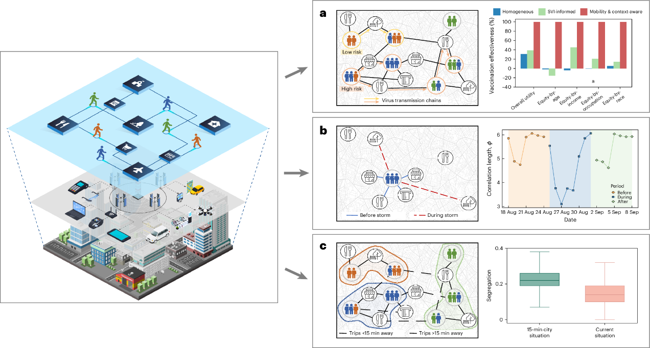 图3.所提分析框架可为疫情方框政策(a)、适应极端天气(b)、推动“15分钟城市”生活方式(c)等重要应用提供洞见