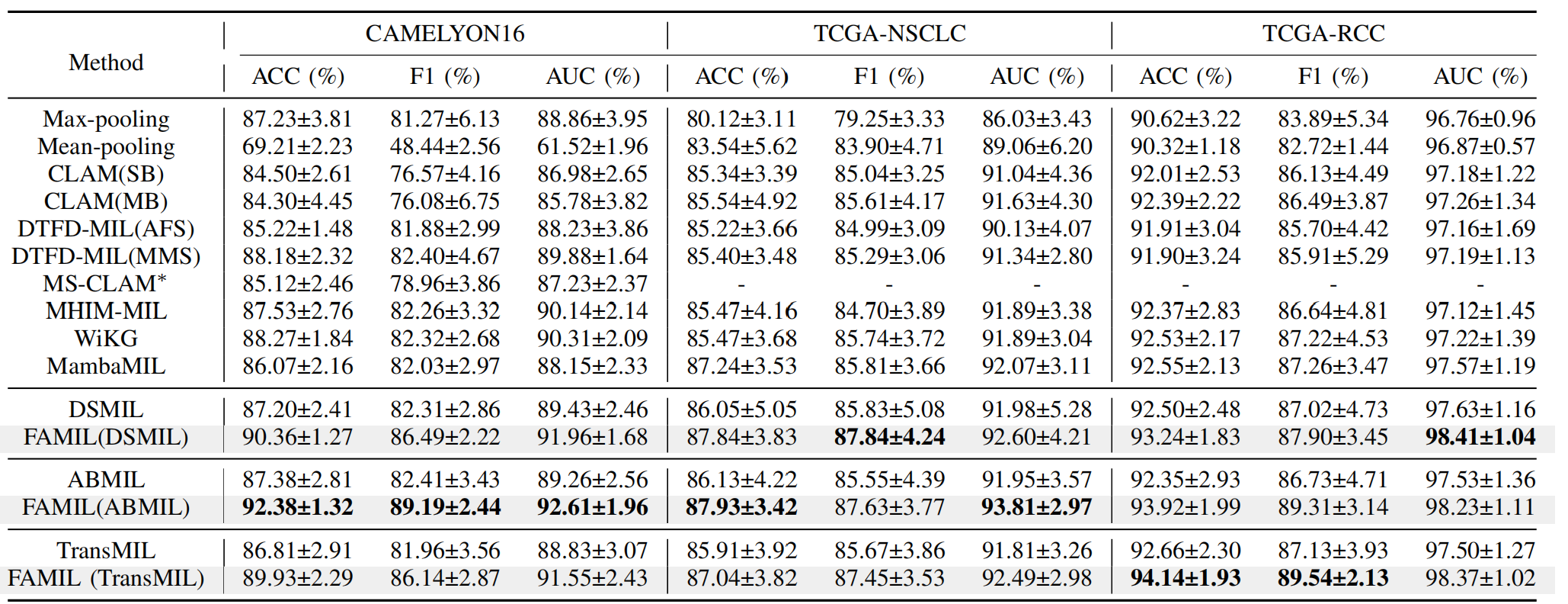 研究团队还选取了ABMIL、DSMIL、TransMIL三种主流注意力MIL方法作为基线模型,并在涵盖不同癌症类型的多组数据集上进行了验证。实验表明,经FAMIL优化后的所有基线模型性能均得到了显著提升。同时,研究团队还将经过FAMIL优化后模型与其他先进的MIL方法进行了比较,进一步验证了研究架构的有效性和先进性。