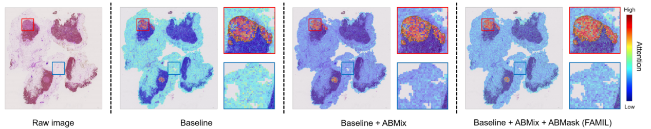 此外,FAMIL框架中的ABMix为阳性区域构建多样化阴性环境,ABMask对WSI中阳性硬实例进行灵活挖掘,两大策略共同增强了模型对阳性特征表征学习,改进了基于注意力的MIL方法肿瘤定位能力,显著改善了阳性WSI中注意力定位不准确和阴性WSI中注意力分布不平衡的问题。