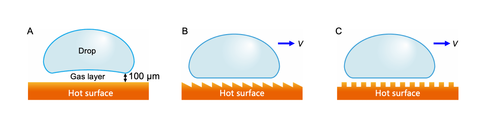 图1. 莱顿弗罗斯特液滴及其自驱动现象。(A)莱顿弗罗斯特效应(1756年报道);(B)传统方法利用非对称结构驱动液滴定向输运(2006年提出);(C)对称结构表面上的液滴自驱动(本研究工作)